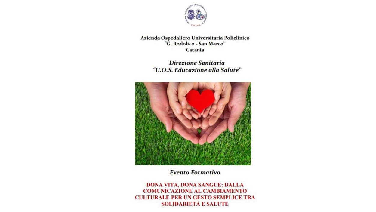 La donazione di sangue è un'azione altruistica che dà benefici a tutta la società. Adeguate scorte di sangue possono essere assicurate solo attraverso donazioni volontarie. La promozione della donazione di sangue come gesto importante di solidarietà per l'intera comunità è il tema principale dell'evento formativo, organizzato dalla U.O.S. Educazione alla Salute. MODALITA' DI ISCRIZIONE https://formazione.csmct.it/EcmPA L'evento formativo è accreditato ECM PROGRAMMA
