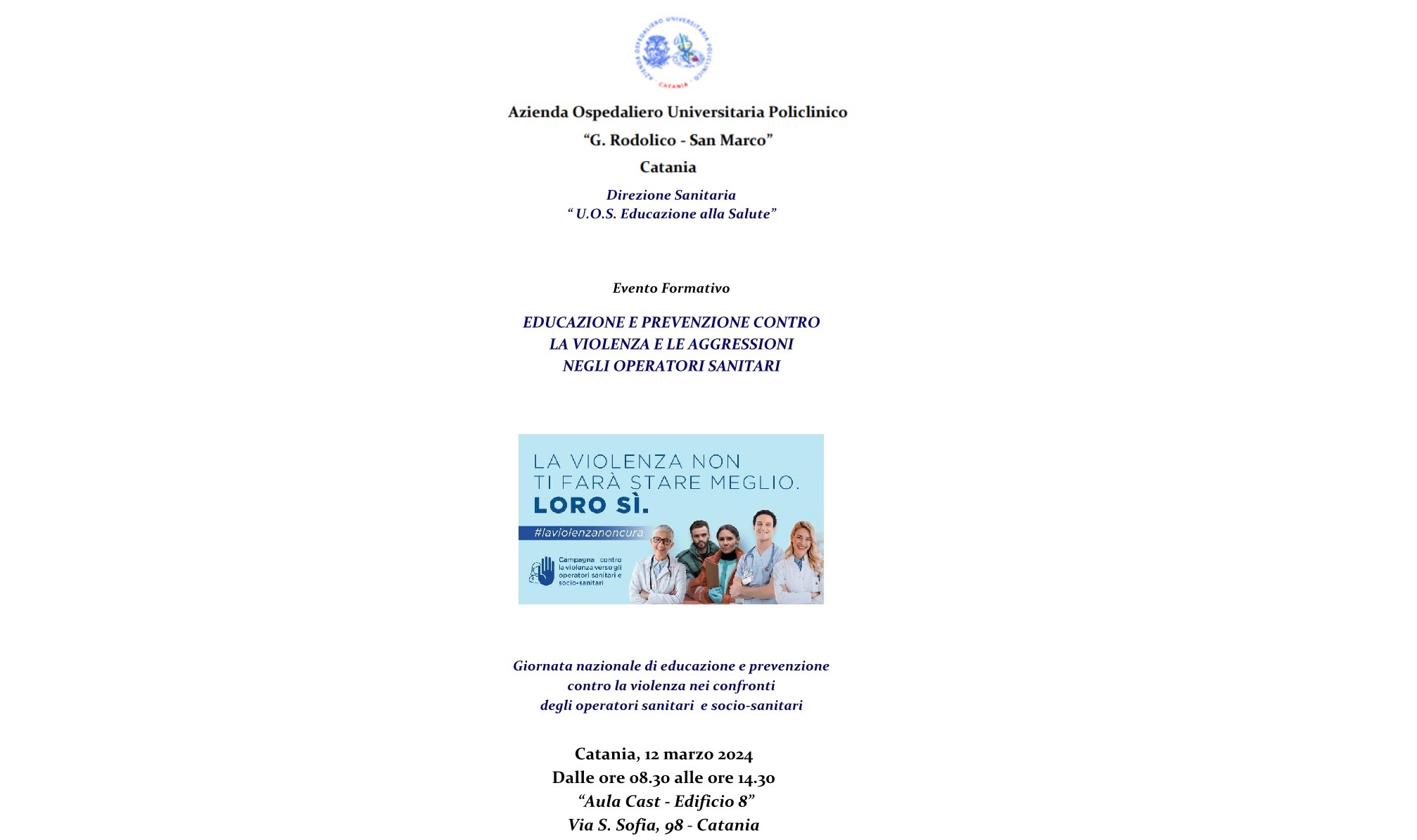 Il seminario "Educazione e Prevenzione contro la violenza e le aggressioni negli operatori sanitari" si svolgerà giorno 12 marzo 2024, nell'Aula Cast dell'Edificio 8 del presidio "G. Rodolico" di via Santa Sofia, in occasione della Giornata nazionale di educazione e prevenzione contro la violenza nei confronti degli operatori sanitari e socio-sanitari. Leggi il programma