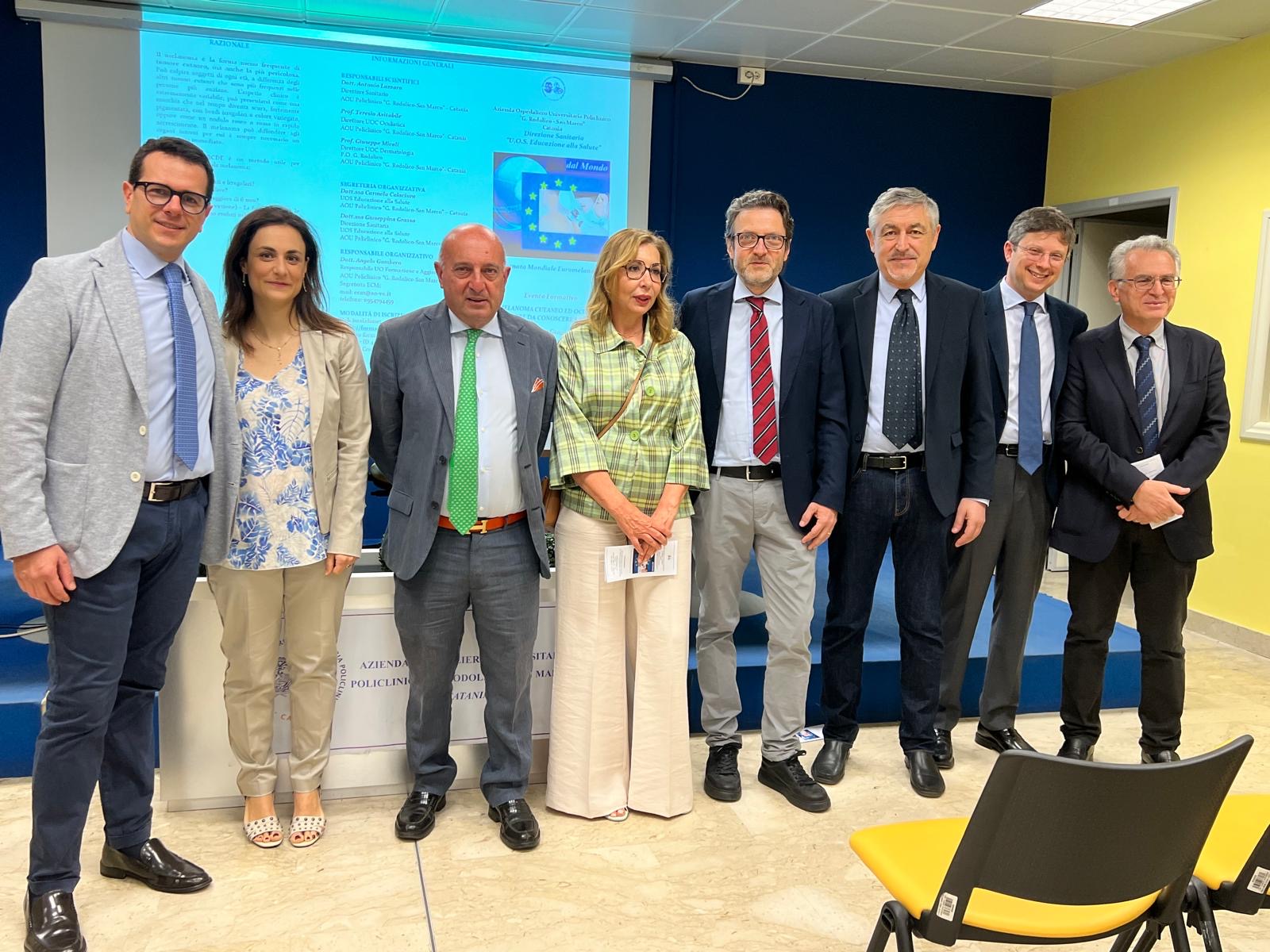 Azienda Ospedaliero Universitaria Policlinico “G.Rodolico – San Marco” Catania Catania, 7 giugno 2024 COMUNICATO STAMPA MELANOMA CUTANEO E OCULARE: DIAGNOSI PREVENTIVA E TRATTAMENTI INNOVATIVI AL CENTRO DEL CONFRONTO TRA PROFESSIONISTI AL POLICLINICO “Melanoma cutaneo e oculare: un tumore da conoscere e prevenire” è stato il tema al centro di un incontro, aperto dal direttore sanitario dell’Azienda Ospedaliero Universitaria etnea, Antonio Lazzara, che ha visto confrontarsi gli esperti delle Unità Operative Complesse del Policlinico “Rodolico” di Dermatologia diretta da Giuseppe Micali, Oculistica diretta da Teresio Avitabile e Anatomia Patologica diretta da Gaetano Magro. L’’organizzazione è stata curata dalle Unità Operative “Educazione alla Salute” ed in particolare da Carmelita Calaciura e Giusy Grasso, e “Aggiornamento e Formazione” di cui è responsabile Angelo Gambera. A moderare le sessioni che si sono susseguite sono stati la dermatologa Letizia Musumeci e l’oculista Antonio Longo. Il melanoma può svilupparsi dove sono presenti i melanociti, le cellule incaricate di produrre melanina, il pigmento responsabile di difendere il corpo dai raggi ultravioletti dannosi per l’epidermide. I melanociti sono presenti sull’epidermide e su altri tessuti, come i tessuti oculari, le mucose della bocca e delle parti intime femminili. “L’incidenza del melanoma cutaneo è in costante aumento –spiega il professore Francesco Lacarrubba dell’UOC Dermatologia- con differenze in funzione di razza e latitudine e interessa tutte le fasce d’età, ma molto raro prima della pubertà. Il fattore di rischio principale è rappresentato da un’esposizione eccessiva e ripetuta ai raggi solari, ed i soggetti con carnagione chiara sono più colpiti. Il melanoma può comparire direttamente su cute sana o derivare dalla trasformazione di un nevo preesistente. La prevenzione del melanoma si basa soprattutto su una corretta esposizione solare, moderata e graduale, evitando le ore più calde ed utilizzando appropriate creme protettive con un alto fattore di protezione solare (detto SPF). La diagnosi precoce è fondamentale, in quanto la mortalità del melanoma in fase avanzata e metastatica è elevata”. “Il nostro obiettivo è identificare il melanoma “In situ”, nella sua fase iniziale quando è ancora di piccole dimensioni per poter fare una diagnosi quanto più precoce possibile anche con l’ausilio degli strumenti a nostra disposizione”, ha quindi sottolineato la dermatologa Anna Elisa Verzì, illustrando le apparecchiature. Per ciò che concerne l’occhio “Il Melanoma Uveale è il tumore maligno oculare più frequente che in Italia fa registrare circa 400 nuovi casi l’anno –chiarisce il professore Andrea Russo dell’UOC Oculistica-. Questa neoplasia, notevolmente maligna, può avere origine dalla coroide, dal corpo ciliare, o dall’iride che nell’insieme costituiscono l’Uvea – lo strato vascolare dell’occhio. La malattia può arrecare gravi danni alla funzione visiva e ha un livello di mortalità elevato. I melanomi oculari possono presentarsi con disturbi della visione, ma, più spesso, sono asintomatici e vengono osservati in occasione di visite oculistiche di routine (da eseguirsi annualmente). Per una corretta diagnosi di melanoma uveale, gli esami fondamentali da praticare sono: Oftalmoscopia cioè l’osservazione del fondo oculare; Angiografia, che evidenzia i dettagli della circolazione tumorale; Ecografia, fondamentale per avere informazioni sull’aspetto istologico, e per valutare le dimensioni del tumore”. “Catania è stata pioniera dell’Adroterapia, trattamento che consente di la conservazione dell’occhio –ha aggiunto il dottor Emilio Malerba della stessa Clinica Oculistica-. Dal 2002 L’Azienda Ospedaliero Universitaria etnea ha creato il primo centro di riferimento in Italia e tutt’oggi siamo tra i pochissimi al mondo a utilizzare la procedura –conclude Russo-. Essa comporta la distruzione del tumore attraverso un danno provocato sul DNA delle cellule tumorali, e dall’effetto citotossico”. “Nell'ambito delle neoplasie cutanee –ha infine affermato il professore Rosario Caltabiano dell’UOC Anatomia Patologica- la patologia melanocitaria rappresenta un campo controverso riguardo alla morfologia di un gruppo di lesioni dal comportamento biologico incerto, c.d. "intermedio". In tali casi una diagnosi accurata richiede spesso di integrare l'osservazione morfologica con indagini di biologia molecolare. La nuova classificazione WHO 2018, oltre ad aver associato le lesioni melanocitarie a differenti “pathway” molecolari, ha introdotto una terminologia che necessita di una condivisione fra esperti del settore al fine di utilizzare un linguaggio comune nei referti anatomo-patologici”. MP