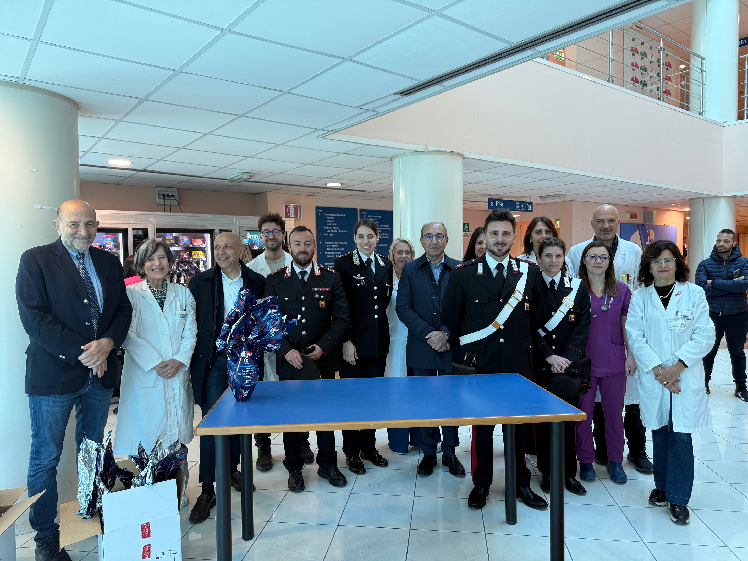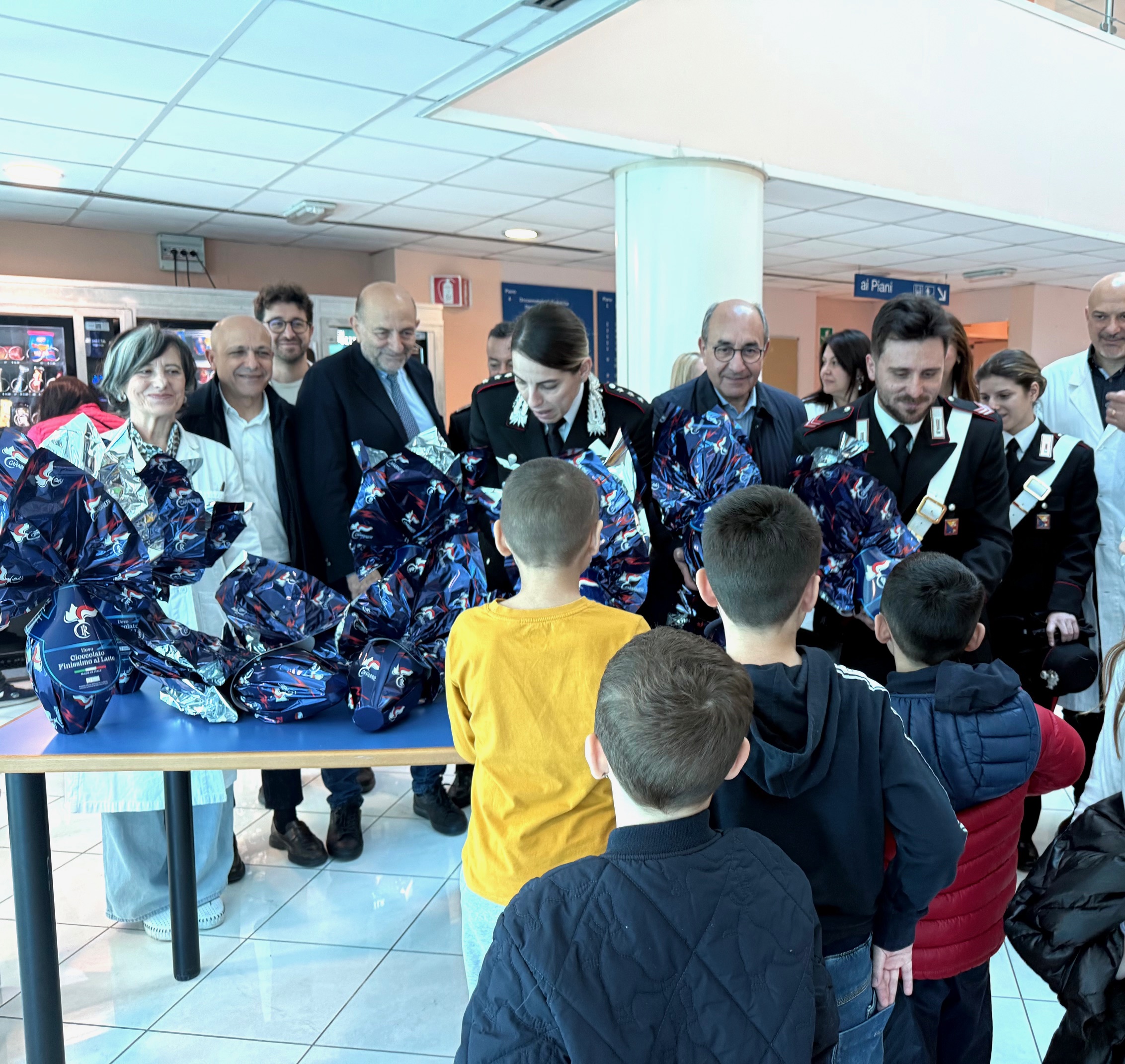 Catania, 23 aprile 2025 PASQUA: CORSA ALLA SOLIDARIETA’ PER REGALARE SORRISI AI PICCOLI PAZIENTI DEL POLICLINICO RODOLICO E DEL SAN MARCO E’ stata una Pasqua nel segno della solidarietà, ricca di sorprese nei due presidi aziendali, il Policlinico “Rodolico” e il San Marco di Catania. Anche quest’anno i piccoli pazienti nei reparti pediatrici dell’AOUP hanno vissuto un clima di festa, grazie ai tanti gesti generosi di istituzioni pubbliche e aziende private, associazioni di volontariato e un gruppo di tifosi del Catania Calcio. Una delegazione dei Carabinieri della stazione di Fontanarossa guidati dal comandante Capitano Beatrice Casamassa sono stati ricevuti dal direttore generale dell’azienda Gaetano Sirna, accompagnato dal direttore sanitario Antonio Lazzara, dal direttore medico di presidio Paolo Adorno e dal direttore dell’UOC di Oncoematologia pediatrica Giovanna Russo, nella hall dell’edificio 4 del Policlinico dove ha sede il reparto. Qui i militari hanno potuto incontrare alcuni bambini con i genitori e donare loro le classiche uova di Pasqua. Doni e sorrisi sono stati regalati anche da diverse aziende del territorio, tra queste in particolare SiciliaFiera e Licitra Service, e dal gruppo di tifosi della Curva Nord della squadra etnea. I bambini e i loro genitori si sono intrattenuti brevemente per qualche sorriso e la foto di rito, ricevendo l’uovo di cioccolato, in un clima per qualche momento allegro e spensierato.