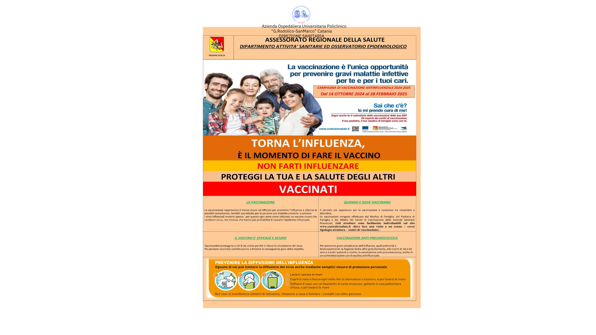 Influ day 2024. Il 14 dicembre, anche a Catania, la giornata dedicata alla vaccinazione antinfluenzale L’iniziativa si colloca nella cornice della Campagna antinfluenzale 2024-25, con l’obiettivo di sensibilizzare l’opinione pubblica sul valore della prevenzione vaccinale. Per l’occasione open day vaccinazioni antinfluenzali al Palazzo Sangiuliano, in Piazza Università, e in 5 ambulatori dell’Asp di Catania. Testimonal dell’evento sarà Francesco Lodi, brand ambassador Catania FC. CATANIA - Si celebra sabato 14 dicembre, sull’intero territorio regionale, l’Influ day 2024, la giornata per la prevenzione vaccinale antinfluenzale, promossa dall’Assessorato regionale alla Salute. L’iniziativa si colloca nella cornice della Campagna antinfluenzale 2024/25, con l’obiettivo di sensibilizzare l’opinione pubblica sul valore della prevenzione vaccinale antinfluenzale e aumentare le coperture. L’Asp di Catania, in collaborazione con ARNAS “Garibaldi”, AOE “Cannizzaro”, AOU Policlinico “Rodolico-San Marco” e l’Università di Catania celebreranno l’Influ day 2024, il 14 dicembre, alle ore 10.30, presso i locali di Palazzo Sangiuliano (in Piazza Università), con la partecipazione del rettore, del sindaco di Catania, dei vertici delle quattro Aziende sanitarie di Catania, del direttore della Scuola di Specializzazione in Igiene e Medicina preventiva, del comitato scientifico dell’accordo quadro Asp di Catania-Università di Catania, dei rappresentanti dell’Ordine dei medici e dell’Ordine delle professioni infermieristiche di Catania, dei medici di medicina generale, dei pediatri di libera scelta, degli operatori sanitari, della Rete civica della salute, del Centro universitario sportivo (Cus), della Croce rossa italiana, dei direttori dei Dipartimenti e delle Unità Operative interessati e coinvolti, a testimonianza dell’importanza del messaggio rivolto alla popolazione. Testimonal dell’evento sarà Francesco Lodi, brand ambassador Catania FC. La Campagna di vaccinazione antinfluenzale 2024/25, coordinata sul territorio provinciale dal Dipartimento di Prevenzione e dall’UOC di Sanità Pubblica, Epidemiologia e Medicina Preventiva dell’Asp di Catania, si concluderà il 29 febbraio 2025. OPEN DAY VACCINAZIONI AL PALAZZO SANGIULIANO E IN 5 AMBULATORI DELL’ASP DI CATANIA Per l’occasione, sempre il 14 dicembre, previsto anche un open day vaccinazioni, dalle ore 9.00 alle ore 13.00, sia presso i locali di Palazzo San Giuliano, sia presso gli ambulatori di vaccinazione dell’Asp di Catania a: - Catania (Corso Italia, 234 e PTA San Giorgio) - Mascalucia (Via Regione Siciliana, 12) - Acireale (Via G. Martinez, 19) - Caltagirone (c/o Ospedale “Gravina” - Edificio “Clementi” - III piano). La vaccinazione antinfluenzale è un’opportunità per prevenire le forme gravi e complicate di influenza e ridurre la mortalità prematura nelle fasce più fragili della popolazione. Oltre alla vaccinazione antinfluenzale, per le categorie previste dal Calendario di Immunizzazione regionale, sarà possibile ricevere, anche in co-somministrazione, la vaccinazione anti-pneumococcica o anti Herpes-zoster; e la vaccinazione anti-virus respiratorio sinciziale (RSV) e anti-Covid. A CHI È RACCOMANDATA LA VACCINAZIONE La vaccinazione antinfluenzale è raccomandata a: • persone anziane, a partire dai 60 anni in su • chi soffre di malattie croniche • residenti in strutture di lungodegenza, quali RSA • bambini a partire dai 6 mesi di vita • operatori sanitari • donne a qualsiasi trimestre di gravidanza • addetti ai servizi pubblici (forze dell’ordine, insegnanti, ecc.) • chi lavora a contatto con gli animali • tutti coloro che vivono con persone ad alto rischio di complicanze La vaccinazione anti-pneumococcica a: • persone anziane, a partire dai 60 anni in su • adulti, d’età compresa fra i 18 e i 59 anni, con patologie a rischio (dietro prescrizione medica) La vaccinazione anti-Herpes zoster • persone anziane, a partire dai 65 anni in su, senza condizioni di rischio • adulti, dai 18 anni in su, con patologie a rischio (dietro prescrizione medica) La vaccinazione anti Covid-19 • persone anziane, a partire dai 60 anni in su • adulti, d’età compresa fra i 18 e i 59 anni, con patologie a rischio • donne in gravidanza La vaccinazione anti-virus respiratorio sinciziale (RSV) • persone anziane, a partire dai 75 anni in su • persone anziane, a partire dai 60 anni in su, con condizioni di rischio (dietro prescrizione medica). DOVE VACCINARSI La vaccinazione antinfluenzale potrà essere eseguita in via prioritaria presso gli ambulatori dei medici di medicina generale e dei pediatri di libera scelta, anche in co-somministrazione con la vaccinazione anti-pneumococcica o anti Herpes-zoster, oltre che presso gli ambulatori vaccinali, previa prenotazione on line, collegandosi al sito aziendale https://vaccini.aspct.it/vacpreno1 e presso le farmacie aderenti. È previsto anche un ambulatorio dedicato alla vaccinazione antinfluenzale sito a Catania, in Corso Italia 234, ad accesso libero, dalle 8.30 alle 11.30, senza necessità di prenotazione. INFO Per informazioni è possibile contattare il proprio medico curante o il Dipartimento di Prevenzione e l’UOC Epidemiologia ai numeri 095.2540104/111/210, o tramite indirizzo mail a uoc.semp@aspct.it. 12 dicembre 2024