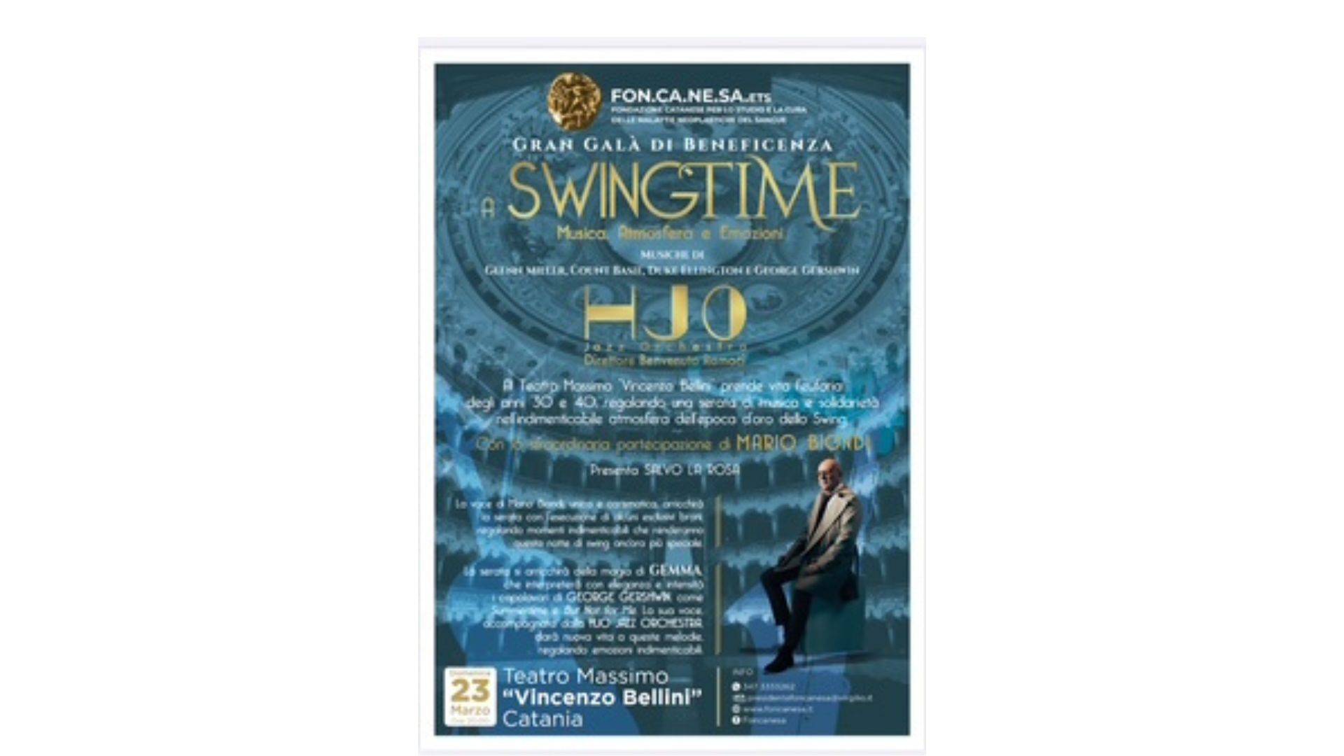 FON.CA.NE.SA.: DOMENICA 23 MARZO CONCERTO DI BENEFICENZA AL BELLINI CON HJO JAZZ ORCHESTRA E MARIO BIONDI Domenica 23 Marzo 2025 alle ore 20.00 nello splendido Teatro Massimo “Vincenzo Bellini” di Catania, si svolgerà l’annuale concerto della Fon.Ca.Ne.Sa giunto alla XXVII° edizione. Quest’anno la Fondazione ha scelto lo swing. Nato negli anni ’30 e fiorito negli anni ’40, rappresenta una delle epoche più iconiche della storia della musica. Artisti come Glenn Miller, Count Basie e Duke Ellington divennero simboli di un’epoca, con brani che ancora oggi evocano emozioni e ricordi senza tempo. “A Swing Time” titolo del concerto è stato pensato per emozionare e far rivivere la stessa atmosfera di quell’epoca.La serata sarà guidata dal talento della HJO Jazz Orchestra, diretta dal maestro Benvenuto Ramaci, che porterà sul palco arrangiamenti curati e fedeli alle tradizioni del grande swing. Ad arricchire l’esperienza, ci sarà la straordinaria partecipazione di Mario Biondi, la cui voce calda e profonda aggiungerà sfumature di soul alle sonorità swing. La sua presenza scenica e il suo carisma cattureranno ogni spettatore, regalando momenti di autentica emozione Inoltre, la serata sarà resa ancora più speciale da Gemma, che interpreterà con grazia e intensità i brani immortali di George Gershwin, come Summertime e But Not for Me. Il Teatro Massimo “Vincenzo Bellini”, sarà la cornice ideale per un tributo alla musica e alla solidarietà.