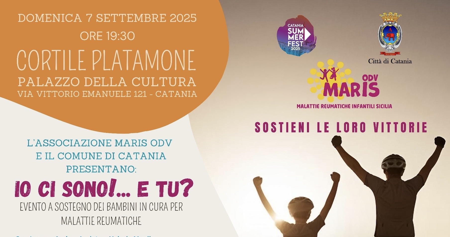 Torna anche quest'anno l'appuntamento con la solidarietà per sostenere i bambini affetti da malattie reumatiche e per essere vicini alle loro famiglie. L'evento, che si terrà domenica 7 settembre alle ore 19.30, è promosso dall'Associazione Maris ODV in collaborazione con il Comune di Catania e il patrocinio, tra gli altri, dell'Azienda Ospedaliero Universitaria Policlinico "G. Rodolico - San Marco". L'appuntamento è al Cortile Platamone, nel Palazzo della Cultura, in via Vittorio Emanuele 121 a Catania. Ingresso ad inviti.