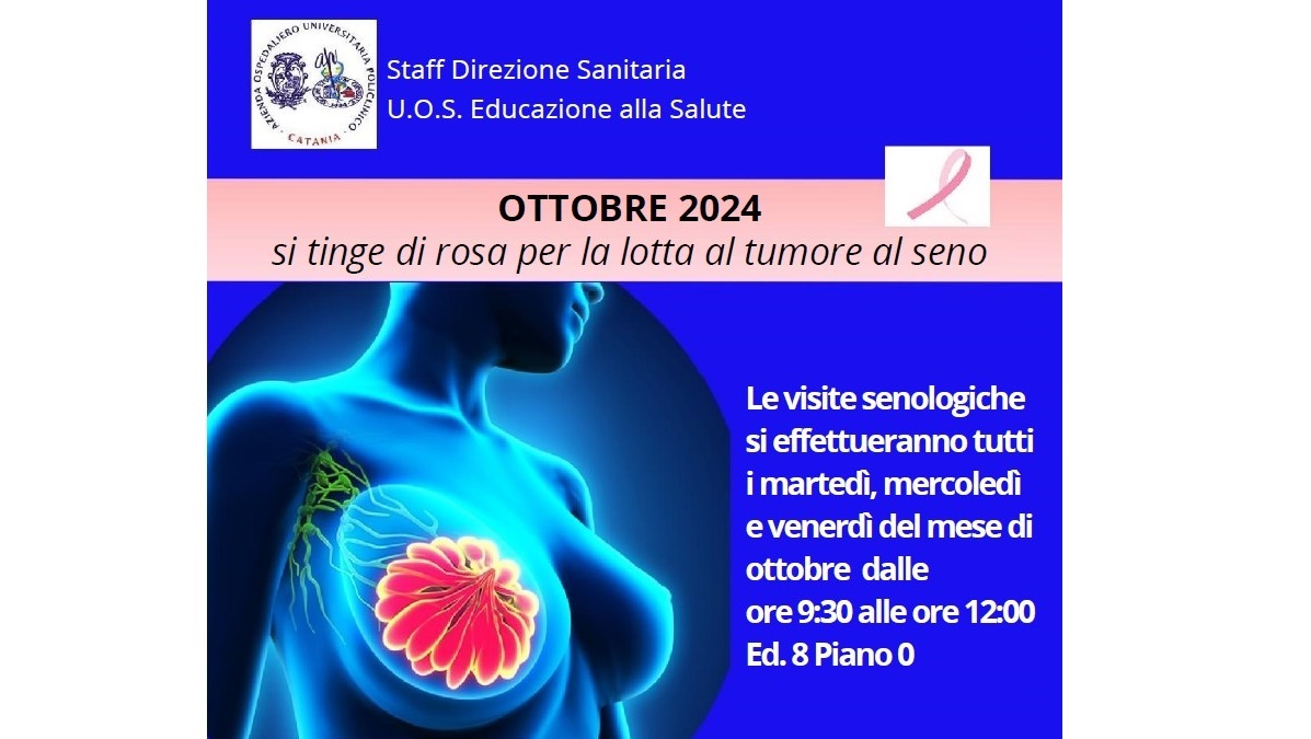 MESE PREVENZIONETUMORI MAMMELLA: DAL 1 OTTOBRE INiZIATIVA PER LE DIPENDENTI AZIENDALI Dal 1 di ottobre, per tutti i martedì, mercoledì e venerdì del mese di ottobre, l’Azienda Ospedaliero Universitaria “G. Rodolico – San Marco” metterà a disposizione SOLO ALLE DIPENDENTI DELL'AZIENDA, donne in età compresa tra i 30 e i 40 anni una visita gratuita sulla prevenzione del tumore al seno, con la possibilità di incontri in presenza, previa prenotazione fino ad esaurimento posti. Per informazioni e prenotazioni sarà necessario chiamare il numero 095 3781599 nei giorni della settimana escluso il giovedì, dalle ore 11 alle ore 13.00. Dopo la visita alla quale seguirà una diagnosi ed eventualmente un percorso terapeutico adatto a ciascuna paziente. Gli incontri avranno luogo nei locali della Breast Unit e della Clinica Chirurgica, all’edificio 8 del presidio “Rodolico” di via Santa Sofia 78. L’Azienda aderisce, così, al mese della prevenzione dei tumori della mammella che si celebra ogni anno ad ottobre.