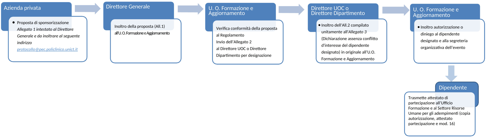Sponsorizzazione Nella sezione è possibile visionare il regolamento per la partecipazione del personale ad eventi formativi esterni all'Azienda, la modulistica e la corretta procedura per parteciparvi. Pubblicato il: 22 febbraio 2023 Ultima revisione: 22 febbraio 2023 Condividi Facebook Twitter Linkedin Whatsapp Azioni Stampa Invia AVVISO IMPORTANTE Per le aziende private che intendono sponsorizzare la partecipazione a congressi, seminari, eventi formativi e manifestazioni varie, devono formalizzare apposita proposta al Direttore Generale dell'Azienda (almeno 45 giorni prima dell'evento) e in nessun caso saranno prese in considerazione richieste di sponsorizzazione contenenti nominativi diversi dal Direttore Generale, in caso contrario si procede al diniego della richiesta. All' interno di questa sezione è possibile visionare: delibera e il regolamento sulla sponsorizzazione; allegati opportunamente compilati secondo la procedura così schematizzata: Delibera e Regolamento All_1 Modulo proposta sulla partecipazione ad eventi formativi All_2 Segnalazione partecipante All_3 Dichiarazione sostitutiva dell' atto di notorietà