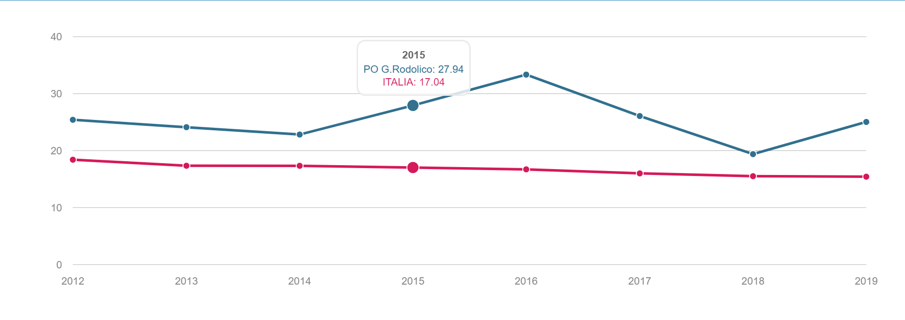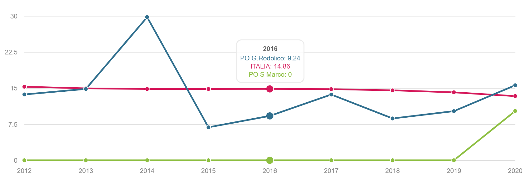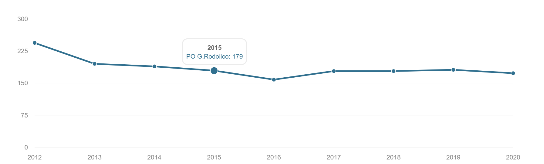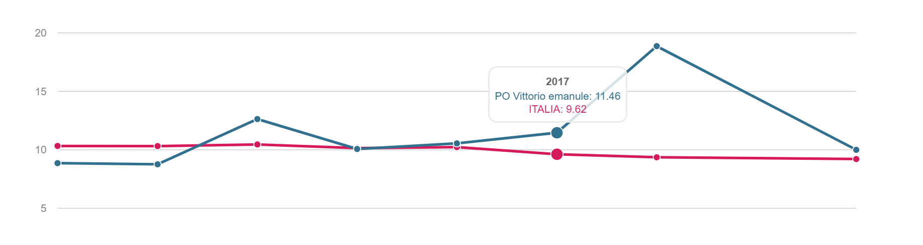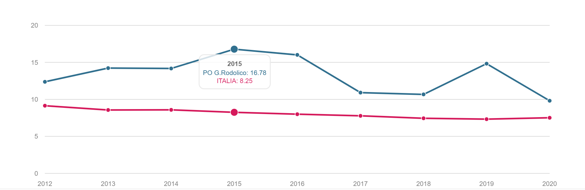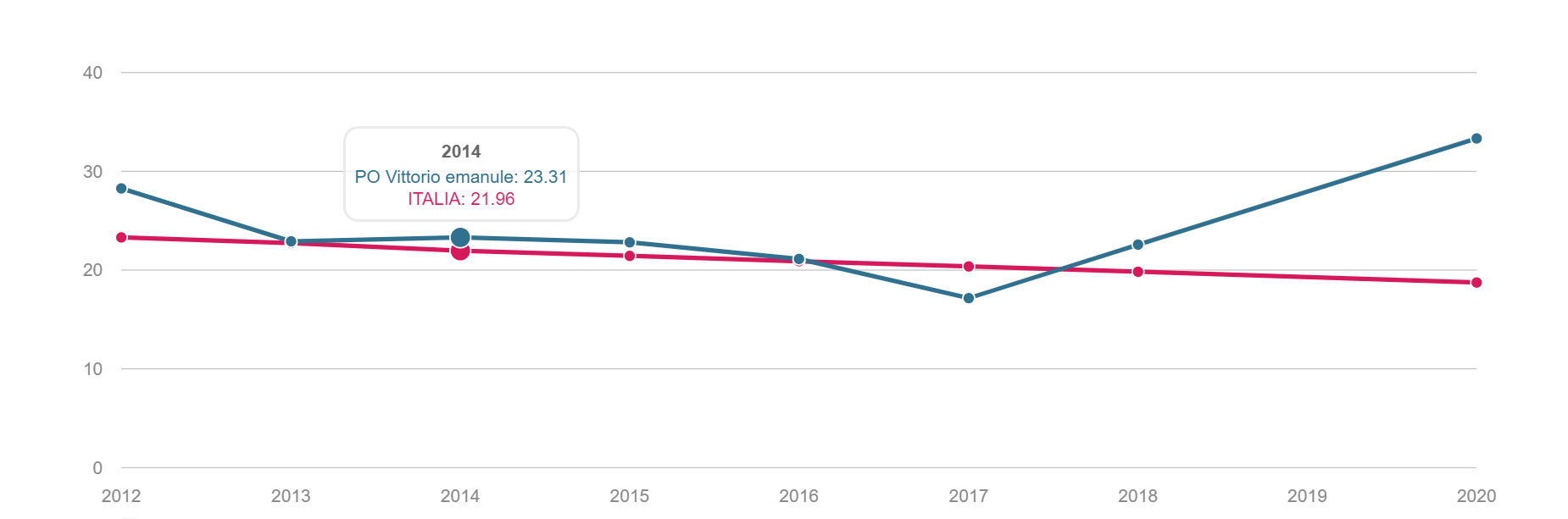 IMA Volume dei ricoveri Per struttura o area di residenza: volume di ricoveri per infarto del miocardio acuto. STEMI STEMI: Volume dei ricoveri Per struttura di ricovero: volume di ricovero ospedaliero per un episodio di STEMI IMA Casi trattati con PTCA entro 2 gg Per struttura di ricovero o area di residenza: proporzione di episodi di IMA trattati con PTCA entro 2 gg. N-STEMI N-STEMI: Volume dei ricoveri Per struttura o area di residenza: volume di ricoveri per un episodio di NO STEMI. STEMI Casi trattati con PTCA entro 2 gg Per struttura di ricovero o area di residenza: proporzione di episodi di STEMI trattati con PTCA entro 2 giorni. IMA Casi trattati con PTCA entro 7 gg Per struttura di ricovero o area di residenza: proporzione di episodi di IMA trattati con PTCA entro 7 gg. IMA Mortalità a 30 gg. (diagnosi principale) Per struttura di ricovero o area di residenza: proporzione di morti a trenta giorni da un ricovero ospedaliero per un episodio di IMA. IMA MACCE a un anno Per struttura o area di residenza: proporzione di eventi maggiori cardiovascolari e cerebrovascolari entro 12 mesi da un ricovero ospedaliero per un episodiodi IMA. IMA Mortalità a 30 gg. con esecuzione di PTCA entro 2 gg Per struttura di ricovero o area di residenza: proporzione di morti a trenta giorni dal ricovero per un episodio di IMA in cui sia stata eseguita una PTCA entro due giorni IMA Mortalità a 30 gg. con esecuzione di PTCA oltre 2 gg Per struttura di ricovero o area di residenza: proporzione di morti a 30gg da una PTCA eseguita per un episodio di IMA oltre 2 gg.dalla data di rocovero IMA Mortalità a un anno Per struttura o area di residenza: proporzione di pazienti sopravvissuti ad un infarto acuto del miocardio e deceduti entro 12 mesi da un ricovero ospedaliero per un episodio di IMA. SCOMPENSO CARDIACO Volume dei ricoveri Per area di residenza :volume di ricoveri per scompenso cardiaco SCOMPENSO CARDIACO Scompenso cardiaco congestizio : Volume di ricoveri: Per area di residenza :volume di ricoveri per scompenso cardiaco congestizio SCOMPENSO CARDIACO Scompenso cardiaco congestizio: Riamissione a 30 gg Per struttura di ricovero o area di residenza: proporzione di morti a trenta giorni dal ricovero per scompenso cardiaco congestizio SCOMPENSO CARDIACO Mortalità a 30 gg Per struttura di ricovero o area di residenza: proporzione di morti a trenta giorni dal ricovero per scompenso cardiaco congestizio ANEURISMA AORTA ADDOMINALE NON ROTTO Volume dei ricoveri Per struttura:volume di ricoveri per interventi chirurgici di riparazione di aneurisma non rotto dell'aorta addominale ANEURISMA AORTA ADDOMINALE NON ROTTO Mortalità Per struttura di ricovero o area di residenza: proporzione di morti a trenta giorni dal ricovero da riparazione di aneurisma non rotto dell'aorta addominale ANEURISMA AORTA ADDOMINALE ROTTO Volume dei ricoveri Per struttura:volume di ricoveri per interventi chirurgici di riparazione di aneurisma rotto dell'aorta addominale STREPPING DI VENE Volume dei ricoveri Per struttura e area di residenza :volume di ricoveri per interventi chirurgici di legatura o stripping di vene degli arti inferiori. BYPASS AORTOCORONARICO Volume dei ricoveri Per struttura:volume di ricoveri per interventi chirurgici di by-pass aortocoronarico isolato BYPASS AORTOCORONARICO Mortalità a 30gg Per struttura di ricovero o area di residenza:proporzione di morti a trenta giorni dall'intervento di BPAC isolato VALVULOPLASTICA Volume dei ricoveri Per struttura :volume di ricoveri perinterventi di valvuloplastica o sostituzione di valvola VALVULOPLASTICA Mortalità a 30gg Per struttura di ricovero o area di residenza: proporzione di morti a trenta giorni dall'intervento di valvuloplastica isolata o sostituzione di valvole cardiache isolata. RIVASCOLARIZZAZIONE ARTI INFERIORI Volume dei ricoveri Per struttura ed area di residenza :volume di ricoveri per intereventi chirurgici di rivascolarizzazione degl arti inferiori. ARTEREOPATIA II E IV STADIO Volume dei ricoveri Per struttura e area di residenza:volume di ricoveri per arteriopatia(II _IV stadio). ARTEREOPATIA III E IV STADIO Amputazione entro 6 mesi Per struttura di ricovero o area di residenza: proporzione di pazienti ricoverati per arteriopatia III e IV stadio con amputazione degli arti inferiori entro 6 mesi dal ricovero. ARTEREOPATIA III E IV STADIO Rivascolarizzazione entro 6 mesi Per struttura di ricovero o area di residenza: proporzione di pazienti con rivascolarizzazione degli arti inferiori entro 6 mesi da un ricovero per arteriopatia III e IV stadio. ARTEREOPATIA III E IV STADIO Mortalità entro 6 mesi Per struttura di ricovero o area di residenza: proporzione di pazienti ricoverati per arteriopatia III e IV stadio deceduti entro 6 mesi dal ricovero. IMA:VOLUME DEI RICOVERI Definizione Per struttura o area di residenza: volume di ricoveri per infarto del miocardio acuto Intervalli di osservazione Intervallo di reclutamento: 1 gennaio 2015- 31 dicembre 2020 IMA:MORTALITA' A 30 GIORNI(DIAGNOSI PRINCIPALE) Definizione Per struttura di ricovero o area di residenza: proporzione di morti a trenta giorni da un ricovero ospedaliero per un episodio di IMA. Numeratore Numero di episodi di IMA, in cui il paziente risulta deceduto entro trenta giorni dalla data del ricovero indice. Denominatore Numero di episodi di IMA. Intervalli di osservazione Possono essere distinti in: intervallo di reclutamento: 1 gennaio 2015 - 30 novembre 2020; intervallo di ricostruzione della storia clinica: 2 anni precedenti a partire dalla data di ammissione del ricovero indice; intervallo di follow-up: 1 mese a partire dalla data di ammissione del ricovero indice. IMA: CASI TRATTATI CON PTCA ENTRO 2 GG Definizione Per struttura di ricovero o area di residenza: proporzione di episodi di IMA trattati con PTCA entro 2 giorni. L’episodio di IMA è costituito da tutti i ricoveri ospedalieri avvenuti entro 4 settimane dalla data del primo ricovero per IMA (ricovero indice). L’intervallo di
