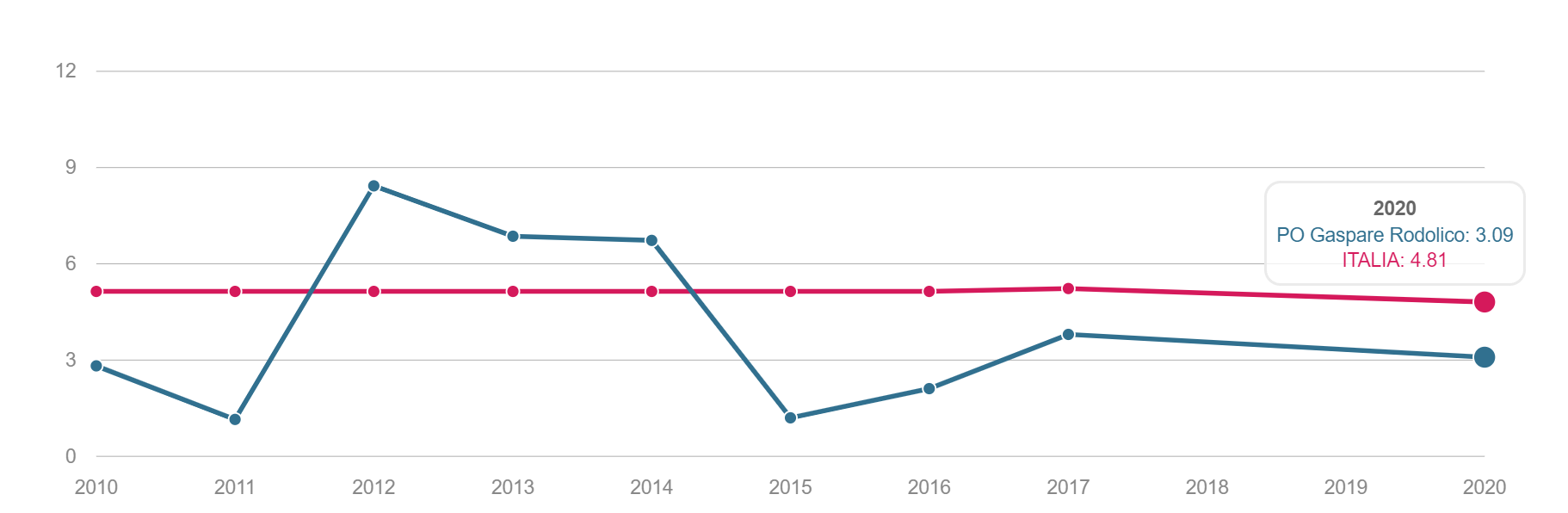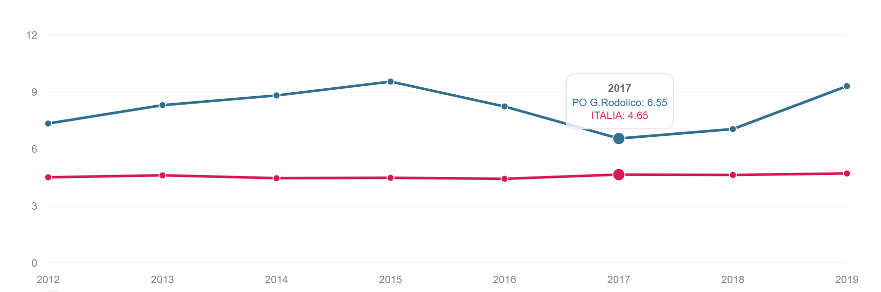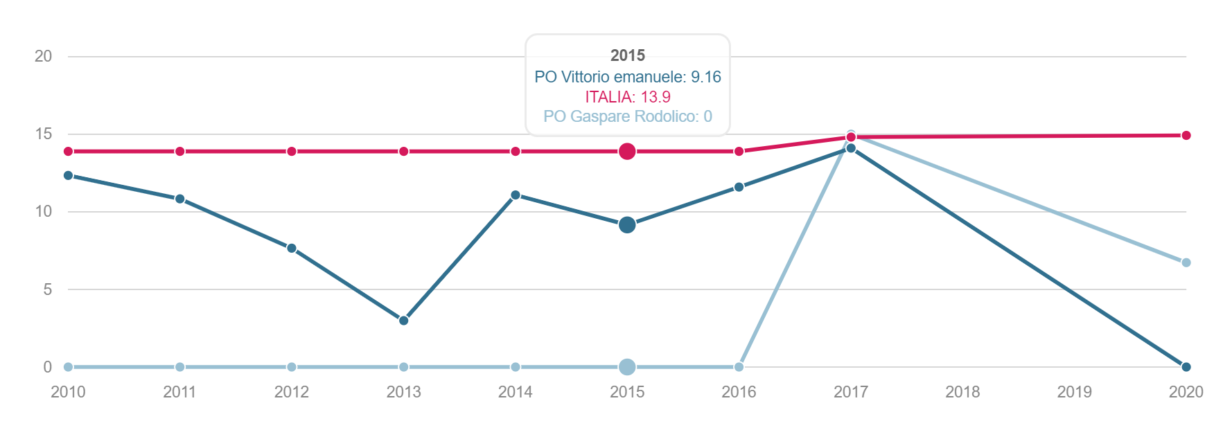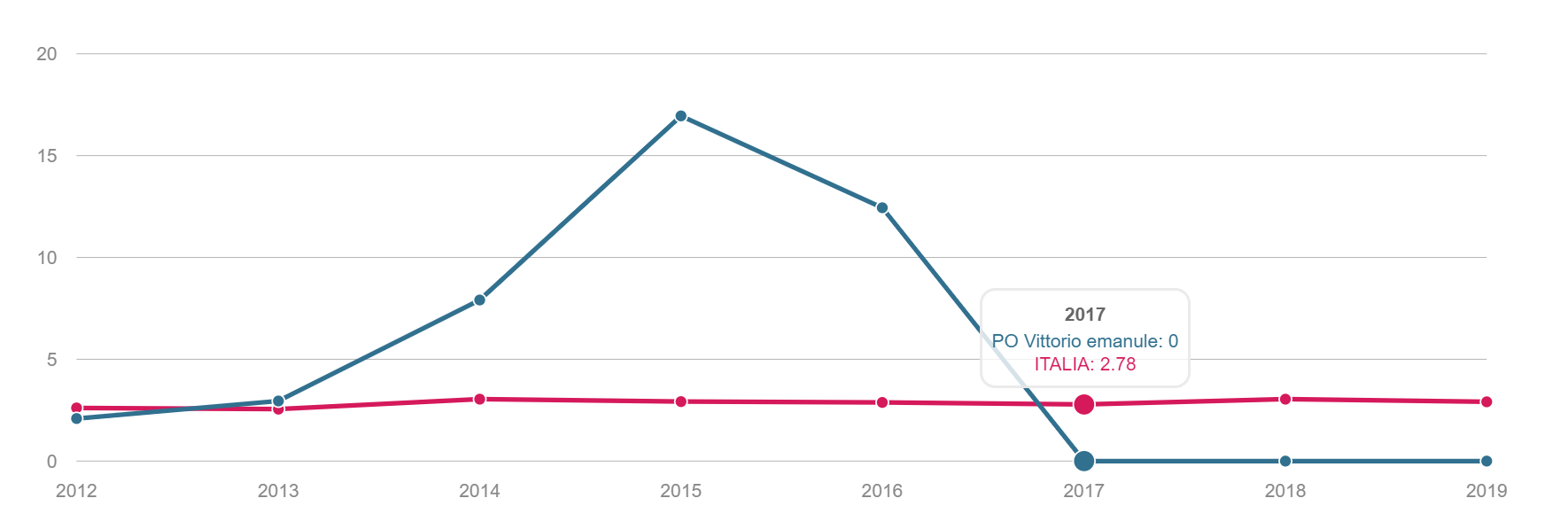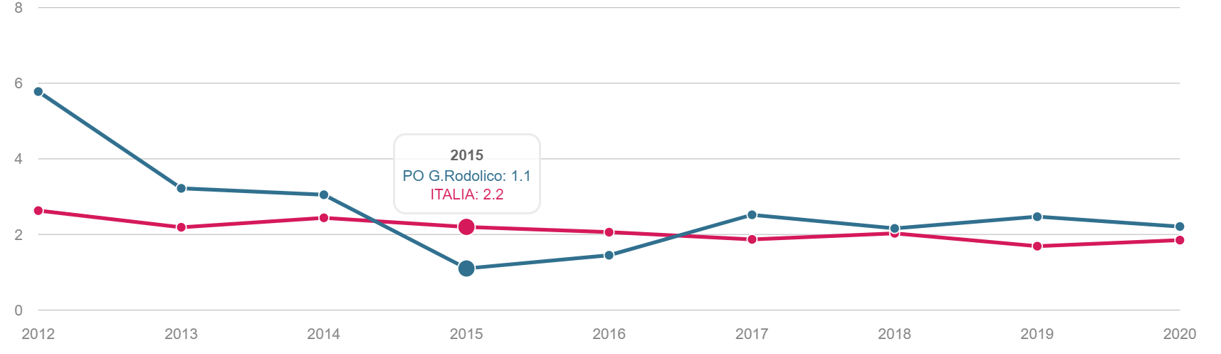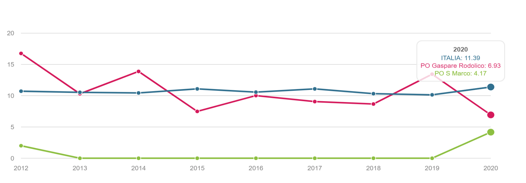 IMA Volume dei ricoveri Per struttura o area di residenza: volume di ricoveri per infarto del miocardio acuto. STEMI STEMI: Volume dei ricoveri Per struttura di ricovero: volume di ricovero ospedaliero per un episodio di STEMI IMA Casi trattati con PTCA entro 2 gg Per struttura di ricovero o area di residenza: proporzione di episodi di IMA trattati con PTCA entro 2 gg. N-STEMI N-STEMI: Volume dei ricoveri Per struttura o area di residenza: volume di ricoveri per un episodio di NO STEMI. STEMI Casi trattati con PTCA entro 2 gg Per struttura di ricovero o area di residenza: proporzione di episodi di STEMI trattati con PTCA entro 2 giorni. IMA Casi trattati con PTCA entro 7 gg Per struttura di ricovero o area di residenza: proporzione di episodi di IMA trattati con PTCA entro 7 gg. IMA Mortalità a 30 gg. (diagnosi principale) Per struttura di ricovero o area di residenza: proporzione di morti a trenta giorni da un ricovero ospedaliero per un episodio di IMA. IMA MACCE a un anno Per struttura o area di residenza: proporzione di eventi maggiori cardiovascolari e cerebrovascolari entro 12 mesi da un ricovero ospedaliero per un episodiodi IMA. IMA Mortalità a 30 gg. con esecuzione di PTCA entro 2 gg Per struttura di ricovero o area di residenza: proporzione di morti a trenta giorni dal ricovero per un episodio di IMA in cui sia stata eseguita una PTCA entro due giorni IMA Mortalità a 30 gg. con esecuzione di PTCA oltre 2 gg Per struttura di ricovero o area di residenza: proporzione di morti a 30gg da una PTCA eseguita per un episodio di IMA oltre 2 gg.dalla data di rocovero IMA Mortalità a un anno Per struttura o area di residenza: proporzione di pazienti sopravvissuti ad un infarto acuto del miocardio e deceduti entro 12 mesi da un ricovero ospedaliero per un episodio di IMA. SCOMPENSO CARDIACO Volume dei ricoveri Per area di residenza :volume di ricoveri per scompenso cardiaco SCOMPENSO CARDIACO Scompenso cardiaco congestizio : Volume di ricoveri: Per area di residenza :volume di ricoveri per scompenso cardiaco congestizio SCOMPENSO CARDIACO Scompenso cardiaco congestizio: Riamissione a 30 gg Per struttura di ricovero o area di residenza: proporzione di morti a trenta giorni dal ricovero per scompenso cardiaco congestizio SCOMPENSO CARDIACO Mortalità a 30 gg Per struttura di ricovero o area di residenza: proporzione di morti a trenta giorni dal ricovero per scompenso cardiaco congestizio ANEURISMA AORTA ADDOMINALE NON ROTTO Volume dei ricoveri Per struttura:volume di ricoveri per interventi chirurgici di riparazione di aneurisma non rotto dell'aorta addominale ANEURISMA AORTA ADDOMINALE NON ROTTO Mortalità Per struttura di ricovero o area di residenza: proporzione di morti a trenta giorni dal ricovero da riparazione di aneurisma non rotto dell'aorta addominale ANEURISMA AORTA ADDOMINALE ROTTO Volume dei ricoveri Per struttura:volume di ricoveri per interventi chirurgici di riparazione di aneurisma rotto dell'aorta addominale STREPPING DI VENE Volume dei ricoveri Per struttura e area di residenza :volume di ricoveri per interventi chirurgici di legatura o stripping di vene degli arti inferiori. BYPASS AORTOCORONARICO Volume dei ricoveri Per struttura:volume di ricoveri per interventi chirurgici di by-pass aortocoronarico isolato BYPASS AORTOCORONARICO Mortalità a 30gg Per struttura di ricovero o area di residenza:proporzione di morti a trenta giorni dall'intervento di BPAC isolato VALVULOPLASTICA Volume dei ricoveri Per struttura :volume di ricoveri perinterventi di valvuloplastica o sostituzione di valvola VALVULOPLASTICA Mortalità a 30gg Per struttura di ricovero o area di residenza: proporzione di morti a trenta giorni dall'intervento di valvuloplastica isolata o sostituzione di valvole cardiache isolata. RIVASCOLARIZZAZIONE ARTI INFERIORI Volume dei ricoveri Per struttura ed area di residenza :volume di ricoveri per intereventi chirurgici di rivascolarizzazione degl arti inferiori. ARTEREOPATIA II E IV STADIO Volume dei ricoveri Per struttura e area di residenza:volume di ricoveri per arteriopatia(II _IV stadio). ARTEREOPATIA III E IV STADIO Amputazione entro 6 mesi Per struttura di ricovero o area di residenza: proporzione di pazienti ricoverati per arteriopatia III e IV stadio con amputazione degli arti inferiori entro 6 mesi dal ricovero. ARTEREOPATIA III E IV STADIO Rivascolarizzazione entro 6 mesi Per struttura di ricovero o area di residenza: proporzione di pazienti con rivascolarizzazione degli arti inferiori entro 6 mesi da un ricovero per arteriopatia III e IV stadio. ARTEREOPATIA III E IV STADIO Mortalità entro 6 mesi Per struttura di ricovero o area di residenza: proporzione di pazienti ricoverati per arteriopatia III e IV stadio deceduti entro 6 mesi dal ricovero. IMA:VOLUME DEI RICOVERI Definizione Per struttura o area di residenza: volume di ricoveri per infarto del miocardio acuto Intervalli di osservazione Intervallo di reclutamento: 1 gennaio 2015- 31 dicembre 2020 IMA:MORTALITA' A 30 GIORNI(DIAGNOSI PRINCIPALE) Definizione Per struttura di ricovero o area di residenza: proporzione di morti a trenta giorni da un ricovero ospedaliero per un episodio di IMA. Numeratore Numero di episodi di IMA, in cui il paziente risulta deceduto entro trenta giorni dalla data del ricovero indice. Denominatore Numero di episodi di IMA. Intervalli di osservazione Possono essere distinti in: intervallo di reclutamento: 1 gennaio 2015 - 30 novembre 2020; intervallo di ricostruzione della storia clinica: 2 anni precedenti a partire dalla data di ammissione del ricovero indice; intervallo di follow-up: 1 mese a partire dalla data di ammissione del ricovero indice. IMA: CASI TRATTATI CON PTCA ENTRO 2 GG Definizione Per struttura di ricovero o area di residenza: proporzione di episodi di IMA trattati con PTCA entro 2 giorni. L’episodio di IMA è costituito da tutti i ricoveri ospedalieri avvenuti entro 4 settimane dalla data del primo ricovero per IMA (ricovero indice). L’intervallo di