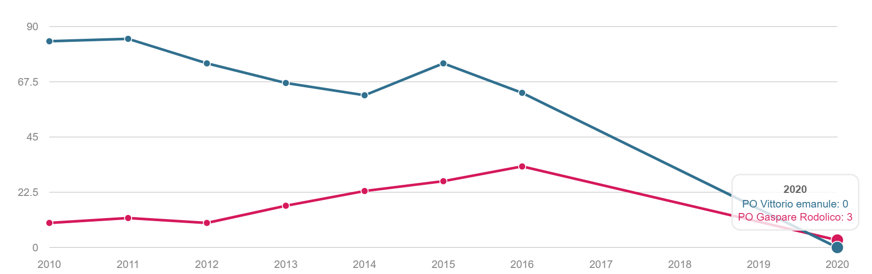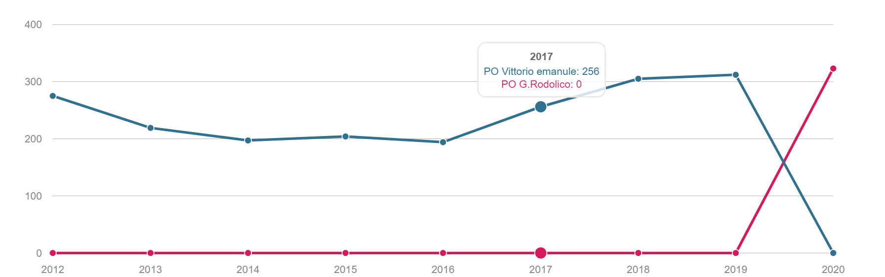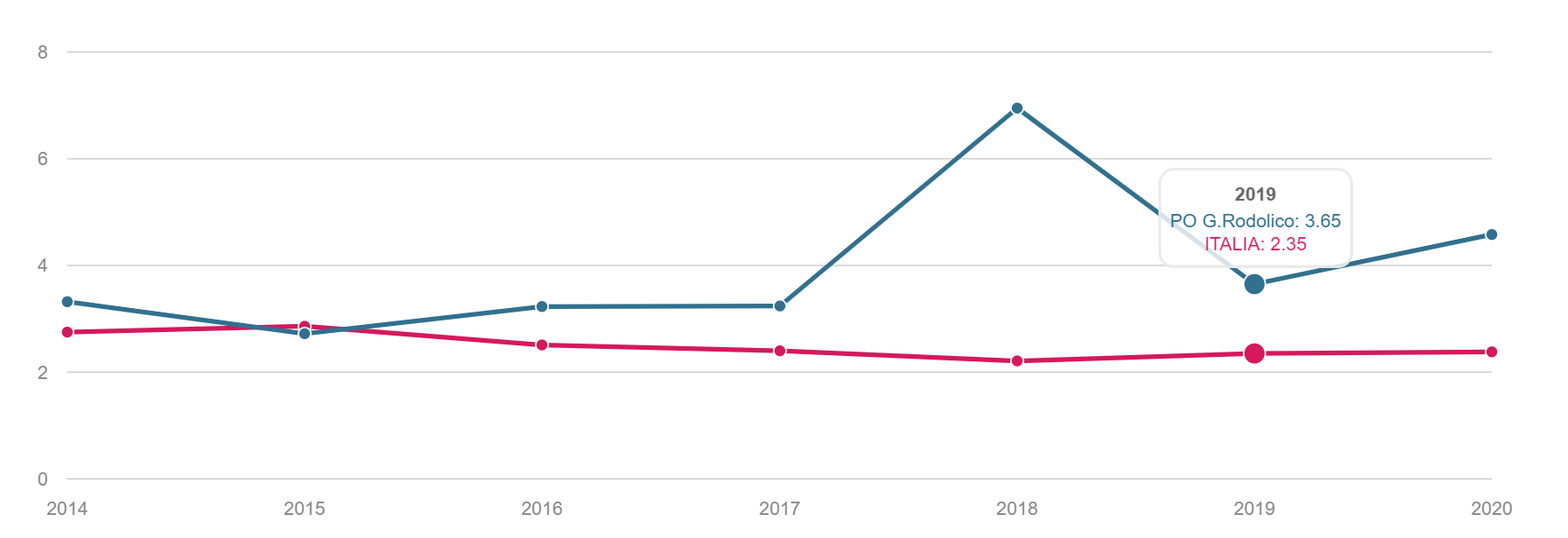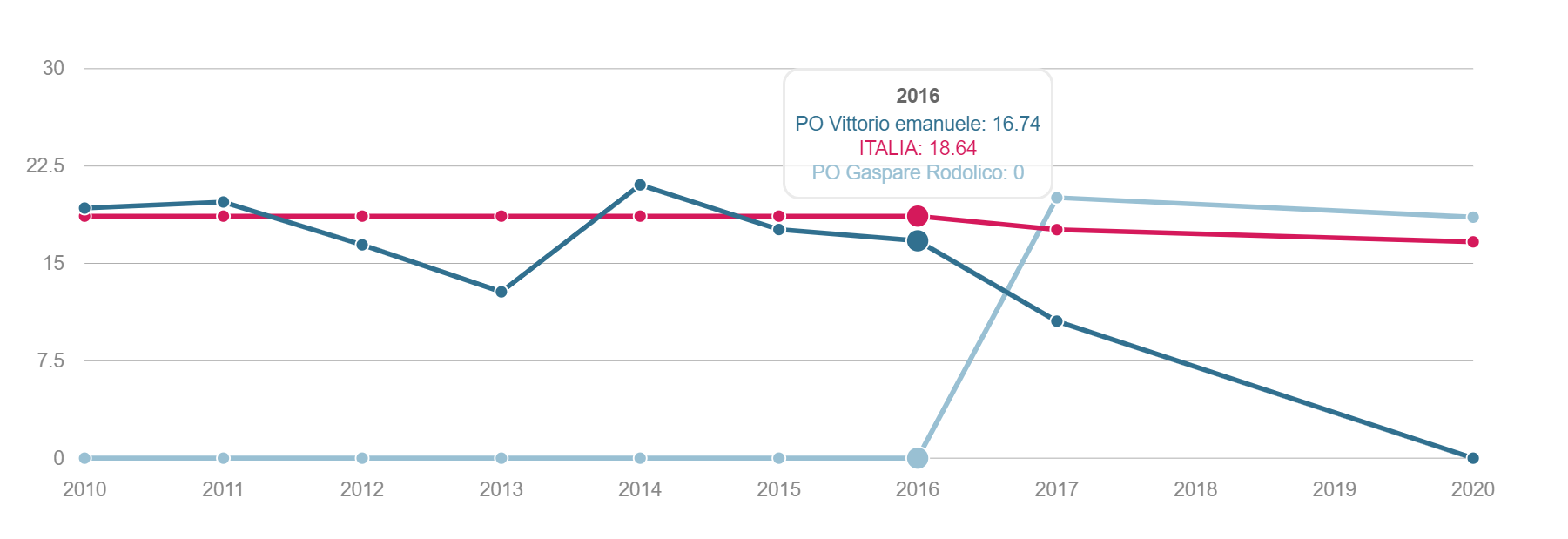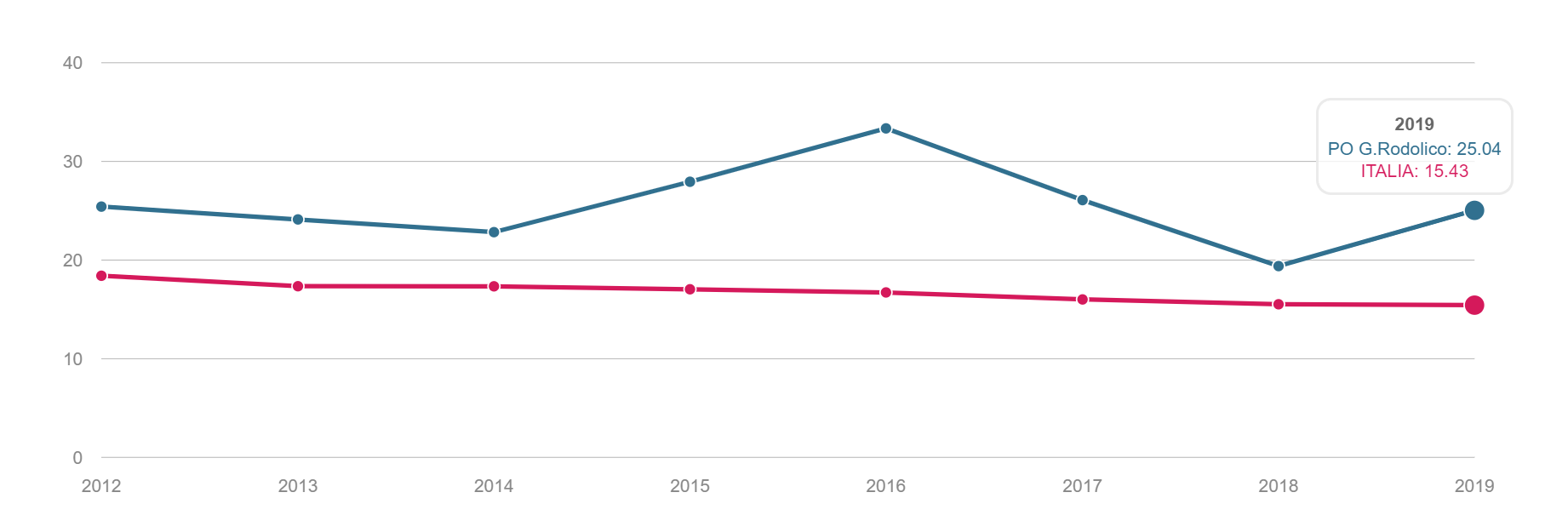IMA Volume dei ricoveri Per struttura o area di residenza: volume di ricoveri per infarto del miocardio acuto. STEMI STEMI: Volume dei ricoveri Per struttura di ricovero: volume di ricovero ospedaliero per un episodio di STEMI IMA Casi trattati con PTCA entro 2 gg Per struttura di ricovero o area di residenza: proporzione di episodi di IMA trattati con PTCA entro 2 gg. N-STEMI N-STEMI: Volume dei ricoveri Per struttura o area di residenza: volume di ricoveri per un episodio di NO STEMI. STEMI Casi trattati con PTCA entro 2 gg Per struttura di ricovero o area di residenza: proporzione di episodi di STEMI trattati con PTCA entro 2 giorni. IMA Casi trattati con PTCA entro 7 gg Per struttura di ricovero o area di residenza: proporzione di episodi di IMA trattati con PTCA entro 7 gg. IMA Mortalità a 30 gg. (diagnosi principale) Per struttura di ricovero o area di residenza: proporzione di morti a trenta giorni da un ricovero ospedaliero per un episodio di IMA. IMA MACCE a un anno Per struttura o area di residenza: proporzione di eventi maggiori cardiovascolari e cerebrovascolari entro 12 mesi da un ricovero ospedaliero per un episodiodi IMA. IMA Mortalità a 30 gg. con esecuzione di PTCA entro 2 gg Per struttura di ricovero o area di residenza: proporzione di morti a trenta giorni dal ricovero per un episodio di IMA in cui sia stata eseguita una PTCA entro due giorni IMA Mortalità a 30 gg. con esecuzione di PTCA oltre 2 gg Per struttura di ricovero o area di residenza: proporzione di morti a 30gg da una PTCA eseguita per un episodio di IMA oltre 2 gg.dalla data di rocovero IMA Mortalità a un anno Per struttura o area di residenza: proporzione di pazienti sopravvissuti ad un infarto acuto del miocardio e deceduti entro 12 mesi da un ricovero ospedaliero per un episodio di IMA. SCOMPENSO CARDIACO Volume dei ricoveri Per area di residenza :volume di ricoveri per scompenso cardiaco SCOMPENSO CARDIACO Scompenso cardiaco congestizio : Volume di ricoveri: Per area di residenza :volume di ricoveri per scompenso cardiaco congestizio SCOMPENSO CARDIACO Scompenso cardiaco congestizio: Riamissione a 30 gg Per struttura di ricovero o area di residenza: proporzione di morti a trenta giorni dal ricovero per scompenso cardiaco congestizio SCOMPENSO CARDIACO Mortalità a 30 gg Per struttura di ricovero o area di residenza: proporzione di morti a trenta giorni dal ricovero per scompenso cardiaco congestizio ANEURISMA AORTA ADDOMINALE NON ROTTO Volume dei ricoveri Per struttura:volume di ricoveri per interventi chirurgici di riparazione di aneurisma non rotto dell'aorta addominale ANEURISMA AORTA ADDOMINALE NON ROTTO Mortalità Per struttura di ricovero o area di residenza: proporzione di morti a trenta giorni dal ricovero da riparazione di aneurisma non rotto dell'aorta addominale ANEURISMA AORTA ADDOMINALE ROTTO Volume dei ricoveri Per struttura:volume di ricoveri per interventi chirurgici di riparazione di aneurisma rotto dell'aorta addominale STREPPING DI VENE Volume dei ricoveri Per struttura e area di residenza :volume di ricoveri per interventi chirurgici di legatura o stripping di vene degli arti inferiori. BYPASS AORTOCORONARICO Volume dei ricoveri Per struttura:volume di ricoveri per interventi chirurgici di by-pass aortocoronarico isolato BYPASS AORTOCORONARICO Mortalità a 30gg Per struttura di ricovero o area di residenza:proporzione di morti a trenta giorni dall'intervento di BPAC isolato VALVULOPLASTICA Volume dei ricoveri Per struttura :volume di ricoveri perinterventi di valvuloplastica o sostituzione di valvola VALVULOPLASTICA Mortalità a 30gg Per struttura di ricovero o area di residenza: proporzione di morti a trenta giorni dall'intervento di valvuloplastica isolata o sostituzione di valvole cardiache isolata. RIVASCOLARIZZAZIONE ARTI INFERIORI Volume dei ricoveri Per struttura ed area di residenza :volume di ricoveri per intereventi chirurgici di rivascolarizzazione degl arti inferiori. ARTEREOPATIA II E IV STADIO Volume dei ricoveri Per struttura e area di residenza:volume di ricoveri per arteriopatia(II _IV stadio). ARTEREOPATIA III E IV STADIO Amputazione entro 6 mesi Per struttura di ricovero o area di residenza: proporzione di pazienti ricoverati per arteriopatia III e IV stadio con amputazione degli arti inferiori entro 6 mesi dal ricovero. ARTEREOPATIA III E IV STADIO Rivascolarizzazione entro 6 mesi Per struttura di ricovero o area di residenza: proporzione di pazienti con rivascolarizzazione degli arti inferiori entro 6 mesi da un ricovero per arteriopatia III e IV stadio. ARTEREOPATIA III E IV STADIO Mortalità entro 6 mesi Per struttura di ricovero o area di residenza: proporzione di pazienti ricoverati per arteriopatia III e IV stadio deceduti entro 6 mesi dal ricovero. IMA:VOLUME DEI RICOVERI Definizione Per struttura o area di residenza: volume di ricoveri per infarto del miocardio acuto Intervalli di osservazione Intervallo di reclutamento: 1 gennaio 2015- 31 dicembre 2020 IMA:MORTALITA' A 30 GIORNI(DIAGNOSI PRINCIPALE) Definizione Per struttura di ricovero o area di residenza: proporzione di morti a trenta giorni da un ricovero ospedaliero per un episodio di IMA. Numeratore Numero di episodi di IMA, in cui il paziente risulta deceduto entro trenta giorni dalla data del ricovero indice. Denominatore Numero di episodi di IMA. Intervalli di osservazione Possono essere distinti in: intervallo di reclutamento: 1 gennaio 2015 - 30 novembre 2020; intervallo di ricostruzione della storia clinica: 2 anni precedenti a partire dalla data di ammissione del ricovero indice; intervallo di follow-up: 1 mese a partire dalla data di ammissione del ricovero indice. IMA: CASI TRATTATI CON PTCA ENTRO 2 GG Definizione Per struttura di ricovero o area di residenza: proporzione di episodi di IMA trattati con PTCA entro 2 giorni. L’episodio di IMA è costituito da tutti i ricoveri ospedalieri avvenuti entro 4 settimane dalla data del primo ricovero per IMA (ricovero indice). L’intervallo di