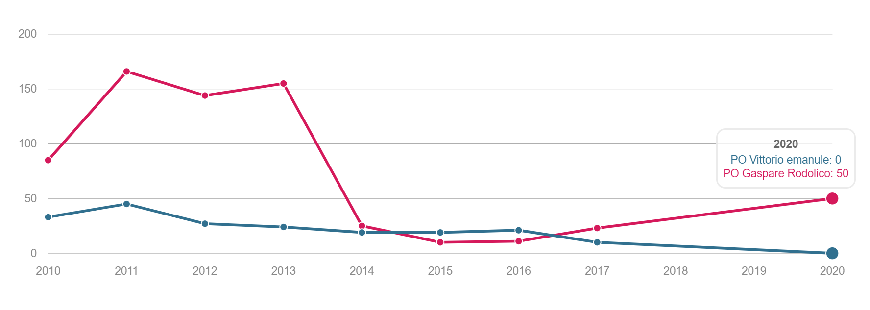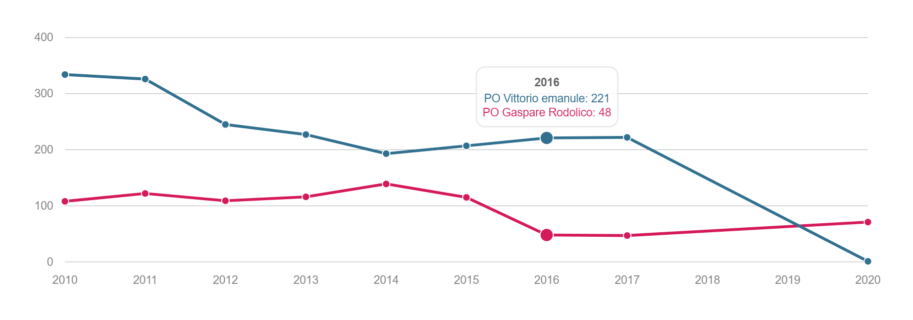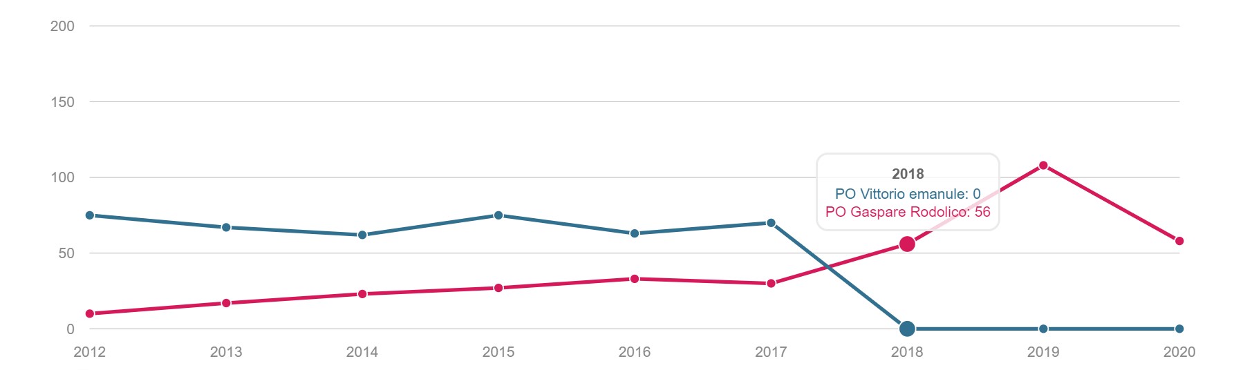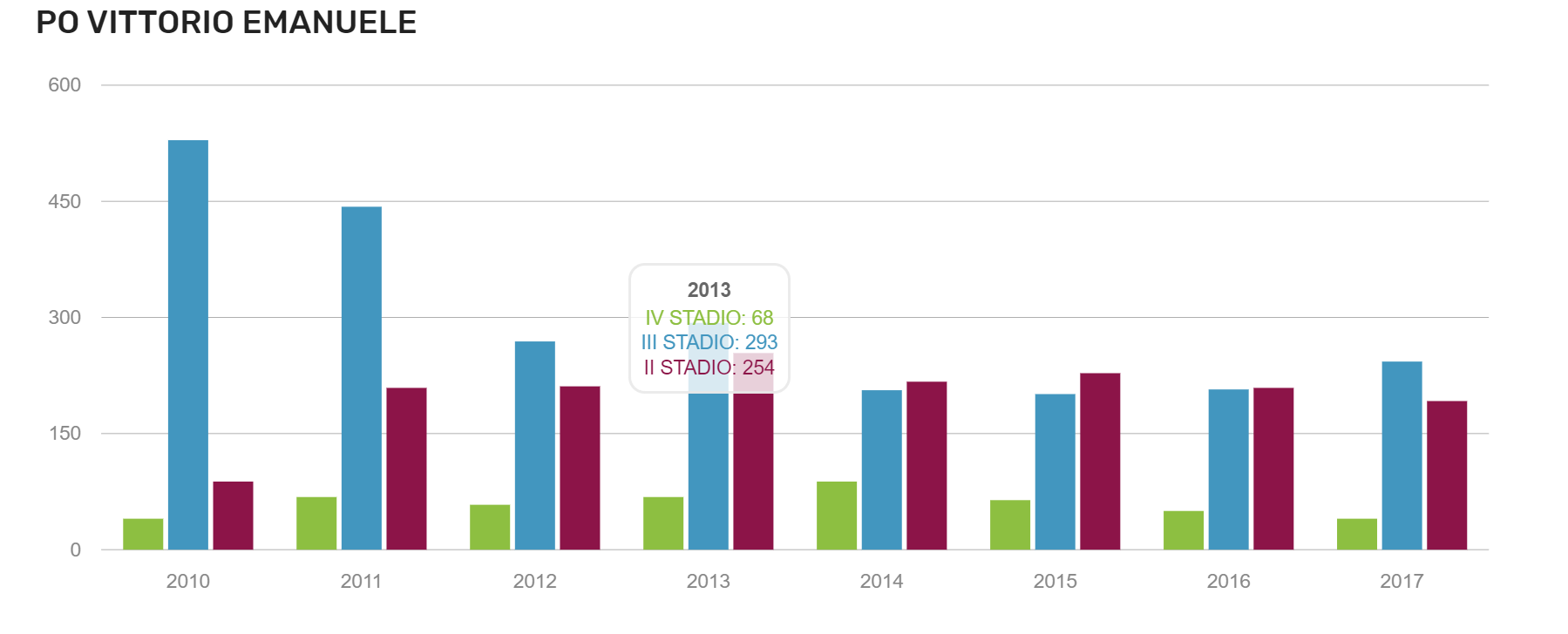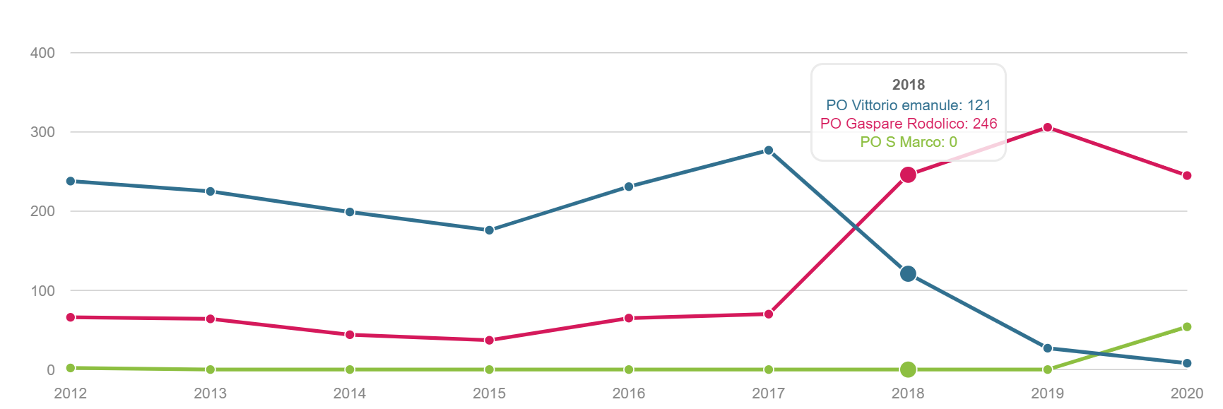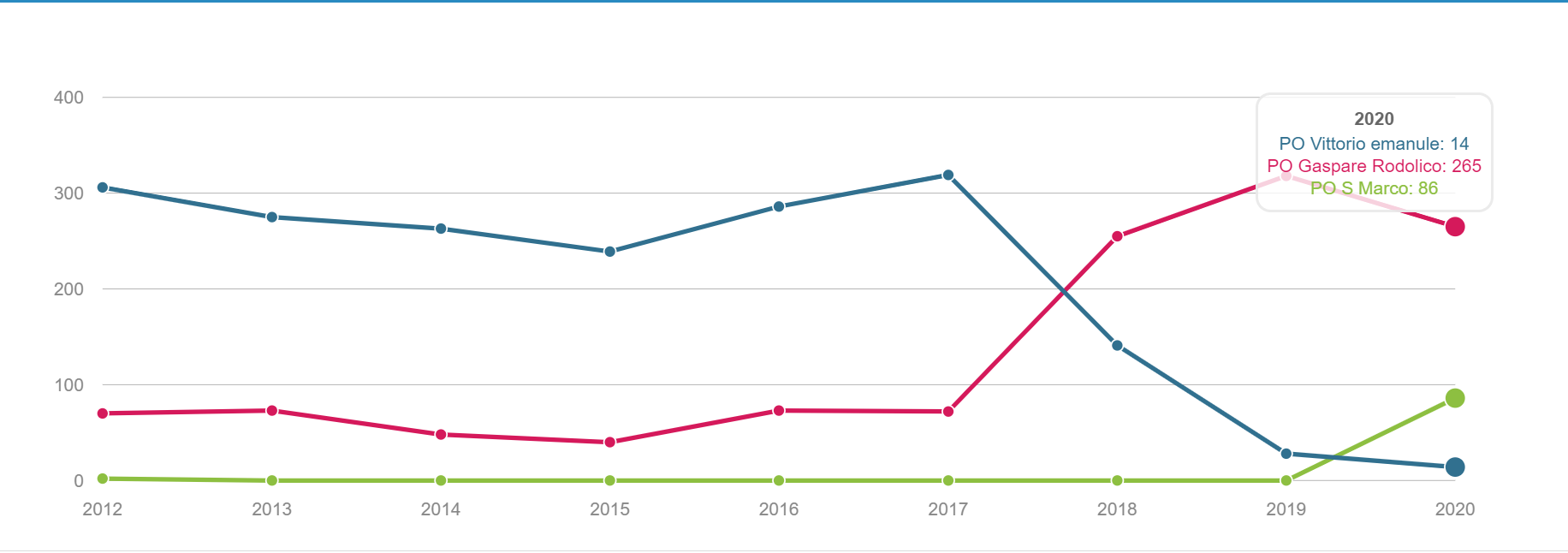 IMA Volume dei ricoveri Per struttura o area di residenza: volume di ricoveri per infarto del miocardio acuto. STEMI STEMI: Volume dei ricoveri Per struttura di ricovero: volume di ricovero ospedaliero per un episodio di STEMI IMA Casi trattati con PTCA entro 2 gg Per struttura di ricovero o area di residenza: proporzione di episodi di IMA trattati con PTCA entro 2 gg. N-STEMI N-STEMI: Volume dei ricoveri Per struttura o area di residenza: volume di ricoveri per un episodio di NO STEMI. STEMI Casi trattati con PTCA entro 2 gg Per struttura di ricovero o area di residenza: proporzione di episodi di STEMI trattati con PTCA entro 2 giorni. IMA Casi trattati con PTCA entro 7 gg Per struttura di ricovero o area di residenza: proporzione di episodi di IMA trattati con PTCA entro 7 gg. IMA Mortalità a 30 gg. (diagnosi principale) Per struttura di ricovero o area di residenza: proporzione di morti a trenta giorni da un ricovero ospedaliero per un episodio di IMA. IMA MACCE a un anno Per struttura o area di residenza: proporzione di eventi maggiori cardiovascolari e cerebrovascolari entro 12 mesi da un ricovero ospedaliero per un episodiodi IMA. IMA Mortalità a 30 gg. con esecuzione di PTCA entro 2 gg Per struttura di ricovero o area di residenza: proporzione di morti a trenta giorni dal ricovero per un episodio di IMA in cui sia stata eseguita una PTCA entro due giorni IMA Mortalità a 30 gg. con esecuzione di PTCA oltre 2 gg Per struttura di ricovero o area di residenza: proporzione di morti a 30gg da una PTCA eseguita per un episodio di IMA oltre 2 gg.dalla data di rocovero IMA Mortalità a un anno Per struttura o area di residenza: proporzione di pazienti sopravvissuti ad un infarto acuto del miocardio e deceduti entro 12 mesi da un ricovero ospedaliero per un episodio di IMA. SCOMPENSO CARDIACO Volume dei ricoveri Per area di residenza :volume di ricoveri per scompenso cardiaco SCOMPENSO CARDIACO Scompenso cardiaco congestizio : Volume di ricoveri: Per area di residenza :volume di ricoveri per scompenso cardiaco congestizio SCOMPENSO CARDIACO Scompenso cardiaco congestizio: Riamissione a 30 gg Per struttura di ricovero o area di residenza: proporzione di morti a trenta giorni dal ricovero per scompenso cardiaco congestizio SCOMPENSO CARDIACO Mortalità a 30 gg Per struttura di ricovero o area di residenza: proporzione di morti a trenta giorni dal ricovero per scompenso cardiaco congestizio ANEURISMA AORTA ADDOMINALE NON ROTTO Volume dei ricoveri Per struttura:volume di ricoveri per interventi chirurgici di riparazione di aneurisma non rotto dell'aorta addominale ANEURISMA AORTA ADDOMINALE NON ROTTO Mortalità Per struttura di ricovero o area di residenza: proporzione di morti a trenta giorni dal ricovero da riparazione di aneurisma non rotto dell'aorta addominale ANEURISMA AORTA ADDOMINALE ROTTO Volume dei ricoveri Per struttura:volume di ricoveri per interventi chirurgici di riparazione di aneurisma rotto dell'aorta addominale STREPPING DI VENE Volume dei ricoveri Per struttura e area di residenza :volume di ricoveri per interventi chirurgici di legatura o stripping di vene degli arti inferiori. BYPASS AORTOCORONARICO Volume dei ricoveri Per struttura:volume di ricoveri per interventi chirurgici di by-pass aortocoronarico isolato BYPASS AORTOCORONARICO Mortalità a 30gg Per struttura di ricovero o area di residenza:proporzione di morti a trenta giorni dall'intervento di BPAC isolato VALVULOPLASTICA Volume dei ricoveri Per struttura :volume di ricoveri perinterventi di valvuloplastica o sostituzione di valvola VALVULOPLASTICA Mortalità a 30gg Per struttura di ricovero o area di residenza: proporzione di morti a trenta giorni dall'intervento di valvuloplastica isolata o sostituzione di valvole cardiache isolata. RIVASCOLARIZZAZIONE ARTI INFERIORI Volume dei ricoveri Per struttura ed area di residenza :volume di ricoveri per intereventi chirurgici di rivascolarizzazione degl arti inferiori. ARTEREOPATIA II E IV STADIO Volume dei ricoveri Per struttura e area di residenza:volume di ricoveri per arteriopatia(II _IV stadio). ARTEREOPATIA III E IV STADIO Amputazione entro 6 mesi Per struttura di ricovero o area di residenza: proporzione di pazienti ricoverati per arteriopatia III e IV stadio con amputazione degli arti inferiori entro 6 mesi dal ricovero. ARTEREOPATIA III E IV STADIO Rivascolarizzazione entro 6 mesi Per struttura di ricovero o area di residenza: proporzione di pazienti con rivascolarizzazione degli arti inferiori entro 6 mesi da un ricovero per arteriopatia III e IV stadio. ARTEREOPATIA III E IV STADIO Mortalità entro 6 mesi Per struttura di ricovero o area di residenza: proporzione di pazienti ricoverati per arteriopatia III e IV stadio deceduti entro 6 mesi dal ricovero. IMA:VOLUME DEI RICOVERI Definizione Per struttura o area di residenza: volume di ricoveri per infarto del miocardio acuto Intervalli di osservazione Intervallo di reclutamento: 1 gennaio 2015- 31 dicembre 2020 IMA:MORTALITA' A 30 GIORNI(DIAGNOSI PRINCIPALE) Definizione Per struttura di ricovero o area di residenza: proporzione di morti a trenta giorni da un ricovero ospedaliero per un episodio di IMA. Numeratore Numero di episodi di IMA, in cui il paziente risulta deceduto entro trenta giorni dalla data del ricovero indice. Denominatore Numero di episodi di IMA. Intervalli di osservazione Possono essere distinti in: intervallo di reclutamento: 1 gennaio 2015 - 30 novembre 2020; intervallo di ricostruzione della storia clinica: 2 anni precedenti a partire dalla data di ammissione del ricovero indice; intervallo di follow-up: 1 mese a partire dalla data di ammissione del ricovero indice. IMA: CASI TRATTATI CON PTCA ENTRO 2 GG Definizione Per struttura di ricovero o area di residenza: proporzione di episodi di IMA trattati con PTCA entro 2 giorni. L’episodio di IMA è costituito da tutti i ricoveri ospedalieri avvenuti entro 4 settimane dalla data del primo ricovero per IMA (ricovero indice). L’intervallo di