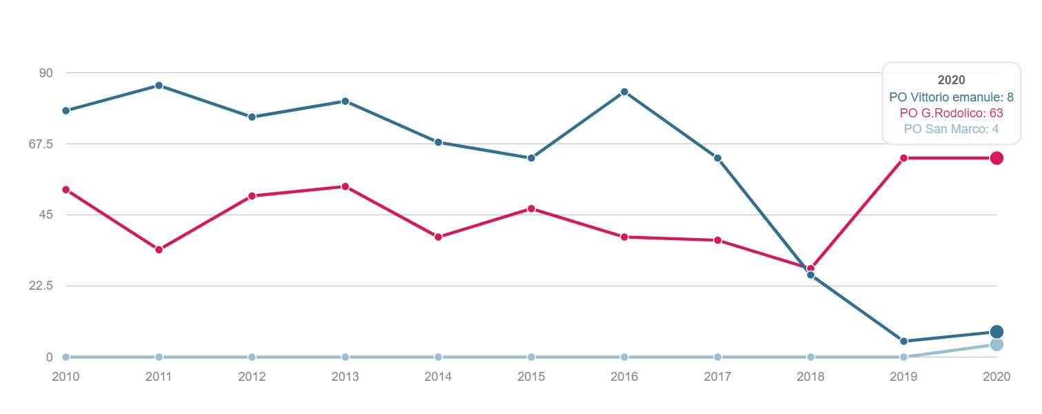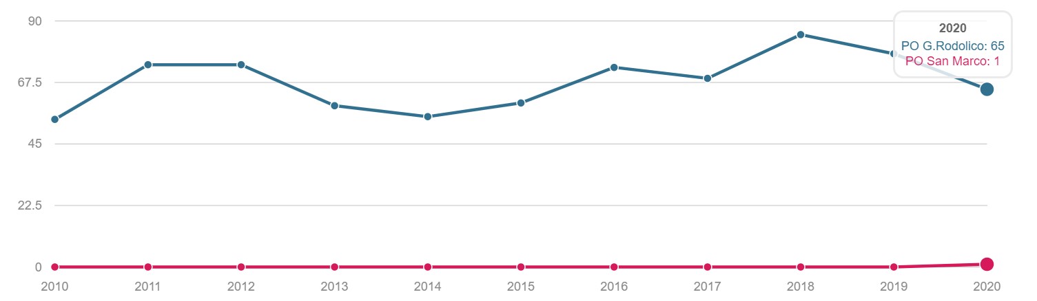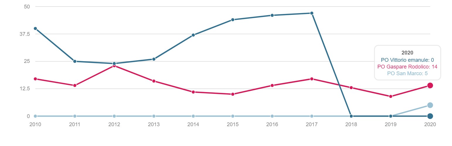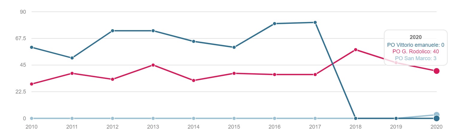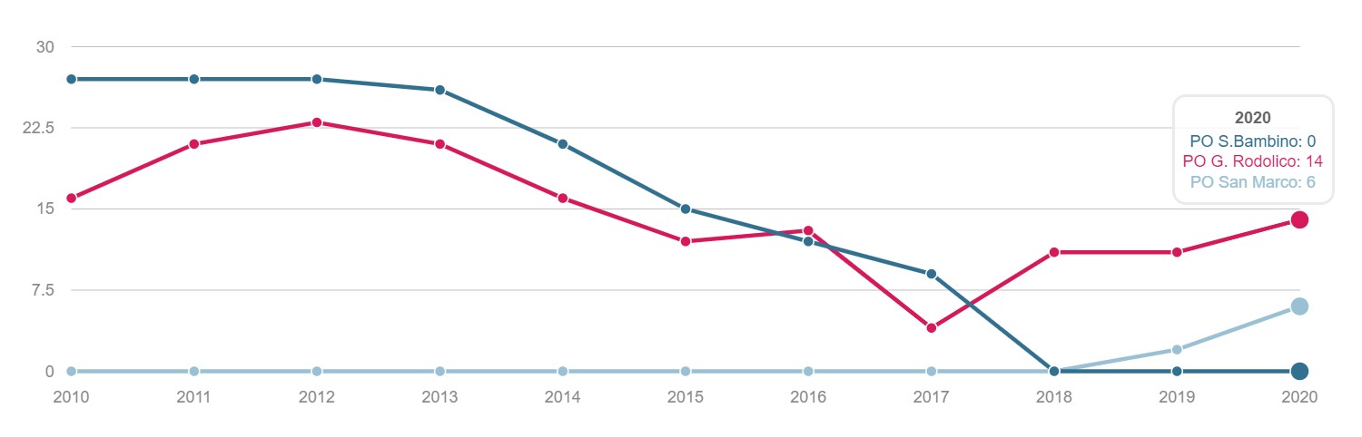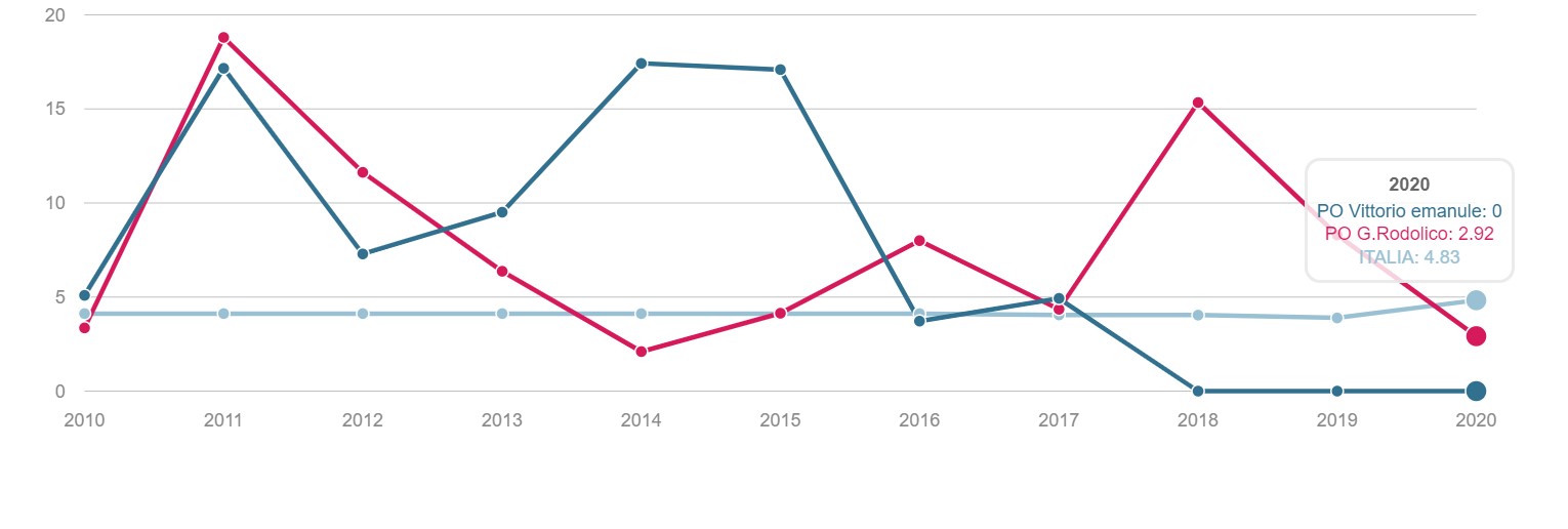 TONSILLECTOMIA Volume dei ricoveri Per struttura o area di residenza: volume di interventi di tonsillectomia. INTERVENTI PER TM LARINGE Volume dei ricoveri Per struttura : volume di ricovero ospedaliero per tumore malino della laringe INTERVENTI PER TM TIROIDE Volume dei ricoveri Per struttura o area di residenza: volume di interventi di tonsillectomia. INTERVENTI PER TM MAMMELLA Volume dei ricoveri Per struttura ed area di residenza: volume di ricoveri per interventi chirurgici per tumore maligno della mammella INTERVENTI PER TM MAMMELLA Interventi conservativi Per struttura ed area di residenza: volume di ricoveri per interventi di cardiochirurgia pediatrica INTERVENTI PER TM MAMMELLA Nuovi interventi di resezione a 90 giorni dall'intervento conservativo Per struttura ed area di residenza: volume di ricoveri per interventi di appendicectomia laparoscopica in età pediatrica INTERVENTI PER TM MAMMELLA Nuovi interventi di resezione a 120 giorni dall'intervento conservativo Per struttura di ricovero o area di residenza: proporzione di nuovo intervento di resezione entro 120 giorni da un intervento chirurgico conservativo per tumore maligno della mammella INTERVENTI PER TM MAMMELLA Ricostruzione o inserzione di espansore nel ricovero indice Per struttura di ricovero o area di residenza: proporzione di intervento di ricostruzione, inserzione di espansore tissutale o impianto di protesi nel ricovero indice per intervento chirurgico demolitivo per tumore invasivo della mammella. INTERVENTI PER TM POLMONE Volume dei ricoveri Per struttura ed area di residenza: volume di ricoveri per interventi chirurgici per tumore maligno del polmone INTERVENTI PER TM POLMONE Mortalità a 30gg Proporzione di morti a trenta giorni dall’intervento per tumore maligno polmonare. INTERVENTI PER TM STOMACO Volume dei ricoveri Per struttura: volume di ricoveri per interventi chirurgici per tumore gastrico maligno. INTERVENTI PER TM STOMACO Mortalità a 30 giorni Per struttura di ricovero o area di residenza: proporzione di morti a trenta giorni dall’intervento per tumore gastrico maligno INTERVENTI PER TM FEGATO Volume di ricoveri Per struttura: volume di ricoveri per interventi chirurgici per tumore maligno del fegato. INTERVENTI PER TM PANCREAS Volume dei ricoveri Per struttura: volume di ricoveri per interventi chirurgici per tumore maligno del pancreas INTERVENTI PER TM COLECISTI Volume di ricoveri: Per struttura: volume di ricoveri per interventi chirurgici per tumore maligno del pancreas . INTERVENTI PER TM COLON Volume dei ricoveri Per struttura e area di residenza: volume di ricoveri per interventi chirurgici per tumore maligno del colon INTERVENTI PER TM COLON Interventi in laparoscopia Per struttura di ricovero o area di residenza: volume di interventi isolati per tumore maligno del colon eseguiti in laparoscopia. INTERVENTI PER TM COLON Mortalità in 30gg Per struttura di ricovero o area di residenza: proporzione di morti a trenta giorni dall’intervento isolato per tumore maligno del colon INTERVENTI PER TM RETTO Interventi in laparoscopia Per struttura di ricovero o area di residenza: volume di interventi isolati per tumore maligno del retto eseguiti in laparoscopia INTERVENTI PER TM RETTO Volume di ricoveri: Per struttura: volume di ricoveri per interventi chirurgici per tumore maligno del retto . INTERVENTI PER TM ESOFAGO Volume dei ricoveri per struttura: volume di ricoveri per interventi chirurgici per tumore maligno dell'esofago. INTERVENTI PER TM RENE Volume di ricoveri Per struttura : volume di ricoveri per interventi chirurgici per tumore maligno del rene INTERVENTO PER TM VESCICA Volume di ricoveri Per struttura: volume di ricoveri per interventi chirurgici per tumore maligno della vescica. INTERVENTO PER TM UTERO Volume di ricoveri Per struttura ed area di residenza: volume di ricoveri per interventi chirurgici per tumore maligno dell’utero INTERVENTI PER TM PROSTATA Riammissione a 30 gg Per struttura di ricovero o area di residenza: proporzione di riammissioni ospedaliere a trenta giorni dall’intervento per tumore maligno della prostata. INTERVENTO PER TM PROSTATECTOMIA RADICALE Volume di ricoveri Per struttura: volume di ricoveri per prostatectomia radicale per tumore maligno della prostata. INTERVENTO PER TM PROSTATA Riamissione a 30 gg Per struttura di ricovero o area di residenza: proporzione di riammissioni ospedaliere a trenta giorni dall’intervento per tumore maligno della prostata. INTERVENTO PER T CEREBRALE Volume di ricoveri Per struttura ed area di residenza:volume di ricoveri per interventi chirurgici di craniotomia per tumore cerebrale. INTERVENTO PER T CEREBRALE Mortalità a 30gg Per struttura o area di residenza: proporzione di morti a trenta giorni dall’intervento di craniotomia eseguita in pazienti con tumore cerebrale PROSTATECTOMIA PER IPERPLASIA BENIGNA Volume di ricoveri Per struttura ed area di residenza:volume di ricoveri per interventi chirurgici di craniotomia per prostatectomia tran uretrale per iperplasia uretrale della prostata . INTERVENTO CHIRURGICO SULL'ORECCHIO MEDIO Volume dei ricoveri Per struttura ed area di residenza : volume di ricoveri di craniotomia per tumore cerebrale IMPIANTO SUI SENI PARANASALI Volume di ricoveri Per struttura : volume di ricoveri per interventi chirurgici sui seni paranasali TONSILLECTOMIA:VOLUME DI RICOVERI Definizione Per struttura e area di residenza: volume di interventi tonsillectomia. Intervalli di osservazione Intervallo di reclutamento: 1 gennaio 2015 - 31 dicembre 2020 INTERVENTI PER TM LARINGE:VOLUME DI RICOVERI Definizione Per struttura: volume di ricoveri per interventi chirurgici per tumore maligno della laringe. Intervalli di osservazione Intervallo di reclutamento: 1 gennaio 2015 - 31 dicembre 2020 INTERVENTI PER TM TIROIDE:VOLUME DI RICOVERI Definizione Per struttura ed area di residenza: volume di ricoveri per interventi chirurgici per tumore maligno della tiroide. Intervalli di osservazione Intervallo 