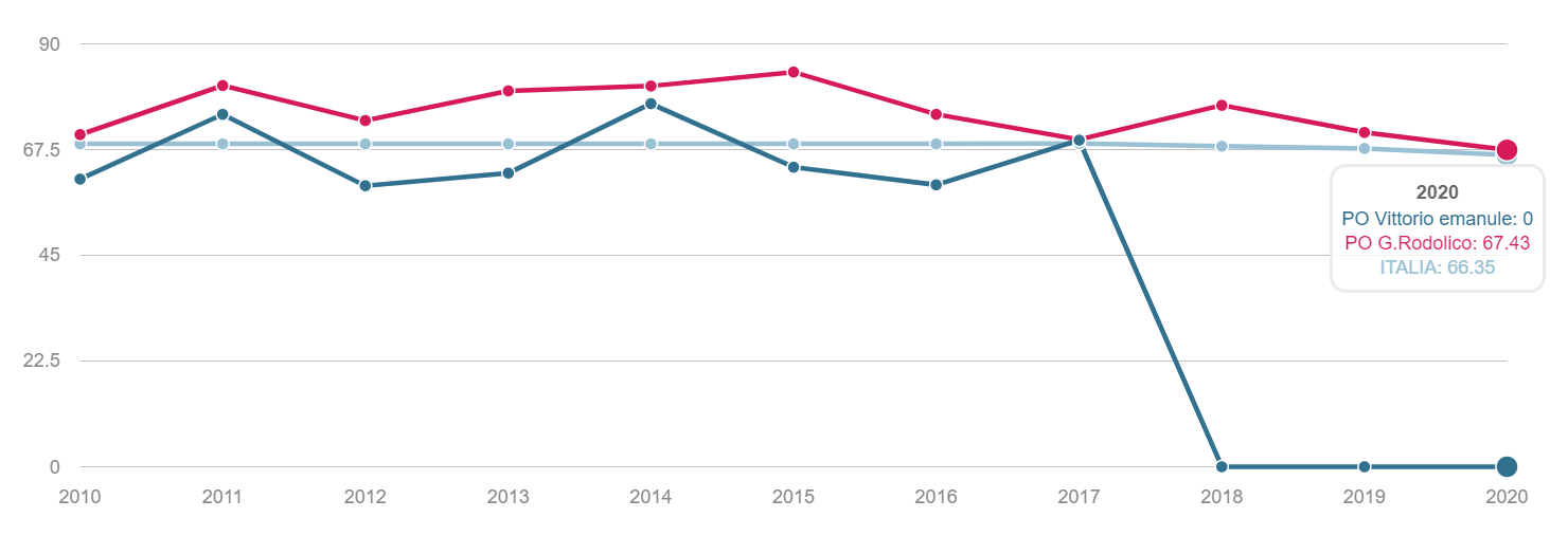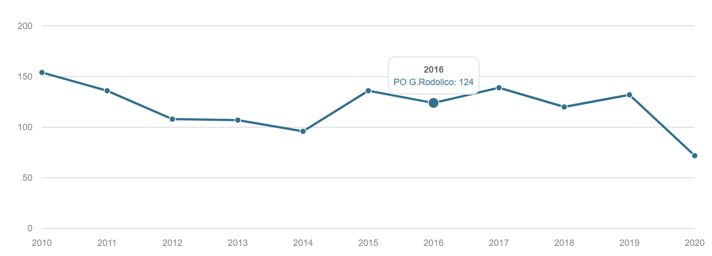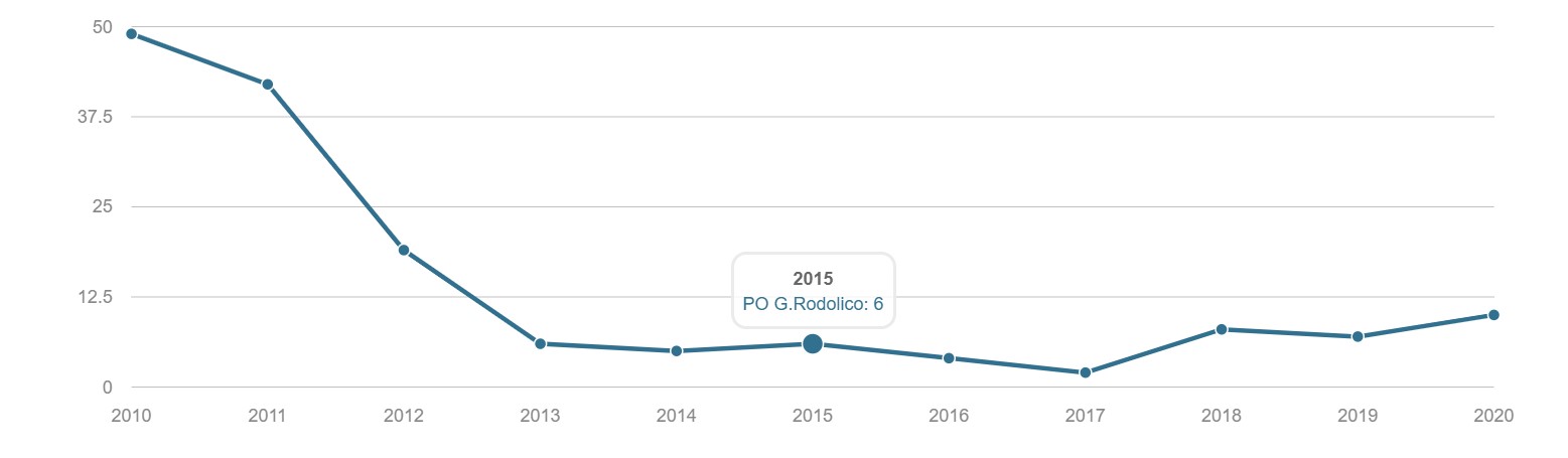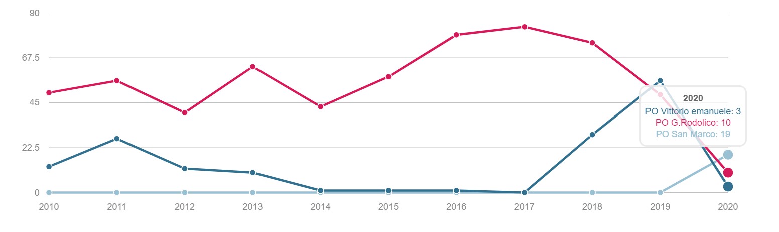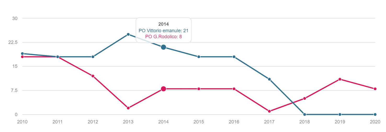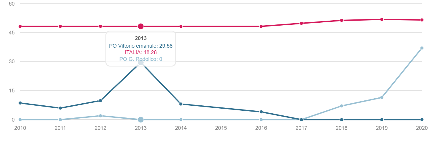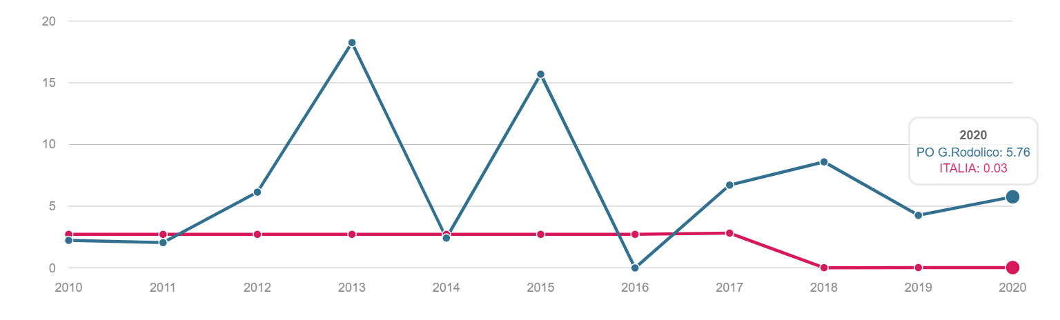 TONSILLECTOMIA Volume dei ricoveri Per struttura o area di residenza: volume di interventi di tonsillectomia. INTERVENTI PER TM LARINGE Volume dei ricoveri Per struttura : volume di ricovero ospedaliero per tumore malino della laringe INTERVENTI PER TM TIROIDE Volume dei ricoveri Per struttura o area di residenza: volume di interventi di tonsillectomia. INTERVENTI PER TM MAMMELLA Volume dei ricoveri Per struttura ed area di residenza: volume di ricoveri per interventi chirurgici per tumore maligno della mammella INTERVENTI PER TM MAMMELLA Interventi conservativi Per struttura ed area di residenza: volume di ricoveri per interventi di cardiochirurgia pediatrica INTERVENTI PER TM MAMMELLA Nuovi interventi di resezione a 90 giorni dall'intervento conservativo Per struttura ed area di residenza: volume di ricoveri per interventi di appendicectomia laparoscopica in età pediatrica INTERVENTI PER TM MAMMELLA Nuovi interventi di resezione a 120 giorni dall'intervento conservativo Per struttura di ricovero o area di residenza: proporzione di nuovo intervento di resezione entro 120 giorni da un intervento chirurgico conservativo per tumore maligno della mammella INTERVENTI PER TM MAMMELLA Ricostruzione o inserzione di espansore nel ricovero indice Per struttura di ricovero o area di residenza: proporzione di intervento di ricostruzione, inserzione di espansore tissutale o impianto di protesi nel ricovero indice per intervento chirurgico demolitivo per tumore invasivo della mammella. INTERVENTI PER TM POLMONE Volume dei ricoveri Per struttura ed area di residenza: volume di ricoveri per interventi chirurgici per tumore maligno del polmone INTERVENTI PER TM POLMONE Mortalità a 30gg Proporzione di morti a trenta giorni dall’intervento per tumore maligno polmonare. INTERVENTI PER TM STOMACO Volume dei ricoveri Per struttura: volume di ricoveri per interventi chirurgici per tumore gastrico maligno. INTERVENTI PER TM STOMACO Mortalità a 30 giorni Per struttura di ricovero o area di residenza: proporzione di morti a trenta giorni dall’intervento per tumore gastrico maligno INTERVENTI PER TM FEGATO Volume di ricoveri Per struttura: volume di ricoveri per interventi chirurgici per tumore maligno del fegato. INTERVENTI PER TM PANCREAS Volume dei ricoveri Per struttura: volume di ricoveri per interventi chirurgici per tumore maligno del pancreas INTERVENTI PER TM COLECISTI Volume di ricoveri: Per struttura: volume di ricoveri per interventi chirurgici per tumore maligno del pancreas . INTERVENTI PER TM COLON Volume dei ricoveri Per struttura e area di residenza: volume di ricoveri per interventi chirurgici per tumore maligno del colon INTERVENTI PER TM COLON Interventi in laparoscopia Per struttura di ricovero o area di residenza: volume di interventi isolati per tumore maligno del colon eseguiti in laparoscopia. INTERVENTI PER TM COLON Mortalità in 30gg Per struttura di ricovero o area di residenza: proporzione di morti a trenta giorni dall’intervento isolato per tumore maligno del colon INTERVENTI PER TM RETTO Interventi in laparoscopia Per struttura di ricovero o area di residenza: volume di interventi isolati per tumore maligno del retto eseguiti in laparoscopia INTERVENTI PER TM RETTO Volume di ricoveri: Per struttura: volume di ricoveri per interventi chirurgici per tumore maligno del retto . INTERVENTI PER TM ESOFAGO Volume dei ricoveri per struttura: volume di ricoveri per interventi chirurgici per tumore maligno dell'esofago. INTERVENTI PER TM RENE Volume di ricoveri Per struttura : volume di ricoveri per interventi chirurgici per tumore maligno del rene INTERVENTO PER TM VESCICA Volume di ricoveri Per struttura: volume di ricoveri per interventi chirurgici per tumore maligno della vescica. INTERVENTO PER TM UTERO Volume di ricoveri Per struttura ed area di residenza: volume di ricoveri per interventi chirurgici per tumore maligno dell’utero INTERVENTI PER TM PROSTATA Riammissione a 30 gg Per struttura di ricovero o area di residenza: proporzione di riammissioni ospedaliere a trenta giorni dall’intervento per tumore maligno della prostata. INTERVENTO PER TM PROSTATECTOMIA RADICALE Volume di ricoveri Per struttura: volume di ricoveri per prostatectomia radicale per tumore maligno della prostata. INTERVENTO PER TM PROSTATA Riamissione a 30 gg Per struttura di ricovero o area di residenza: proporzione di riammissioni ospedaliere a trenta giorni dall’intervento per tumore maligno della prostata. INTERVENTO PER T CEREBRALE Volume di ricoveri Per struttura ed area di residenza:volume di ricoveri per interventi chirurgici di craniotomia per tumore cerebrale. INTERVENTO PER T CEREBRALE Mortalità a 30gg Per struttura o area di residenza: proporzione di morti a trenta giorni dall’intervento di craniotomia eseguita in pazienti con tumore cerebrale PROSTATECTOMIA PER IPERPLASIA BENIGNA Volume di ricoveri Per struttura ed area di residenza:volume di ricoveri per interventi chirurgici di craniotomia per prostatectomia tran uretrale per iperplasia uretrale della prostata . INTERVENTO CHIRURGICO SULL'ORECCHIO MEDIO Volume dei ricoveri Per struttura ed area di residenza : volume di ricoveri di craniotomia per tumore cerebrale IMPIANTO SUI SENI PARANASALI Volume di ricoveri Per struttura : volume di ricoveri per interventi chirurgici sui seni paranasali TONSILLECTOMIA:VOLUME DI RICOVERI Definizione Per struttura e area di residenza: volume di interventi tonsillectomia. Intervalli di osservazione Intervallo di reclutamento: 1 gennaio 2015 - 31 dicembre 2020 INTERVENTI PER TM LARINGE:VOLUME DI RICOVERI Definizione Per struttura: volume di ricoveri per interventi chirurgici per tumore maligno della laringe. Intervalli di osservazione Intervallo di reclutamento: 1 gennaio 2015 - 31 dicembre 2020 INTERVENTI PER TM TIROIDE:VOLUME DI RICOVERI Definizione Per struttura ed area di residenza: volume di ricoveri per interventi chirurgici per tumore maligno della tiroide. Intervalli di osservazione Intervallo 