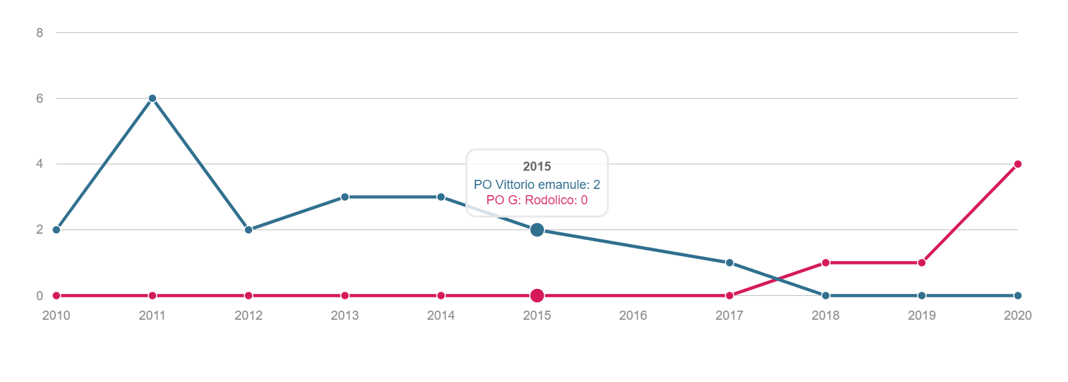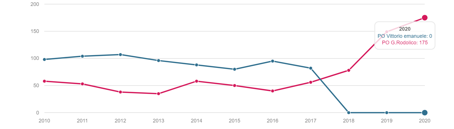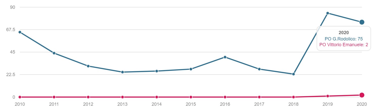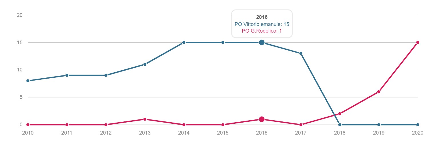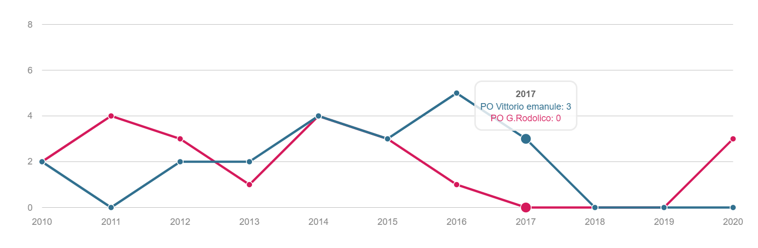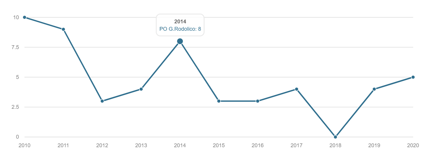 TONSILLECTOMIA Volume dei ricoveri Per struttura o area di residenza: volume di interventi di tonsillectomia. INTERVENTI PER TM LARINGE Volume dei ricoveri Per struttura : volume di ricovero ospedaliero per tumore malino della laringe INTERVENTI PER TM TIROIDE Volume dei ricoveri Per struttura o area di residenza: volume di interventi di tonsillectomia. INTERVENTI PER TM MAMMELLA Volume dei ricoveri Per struttura ed area di residenza: volume di ricoveri per interventi chirurgici per tumore maligno della mammella INTERVENTI PER TM MAMMELLA Interventi conservativi Per struttura ed area di residenza: volume di ricoveri per interventi di cardiochirurgia pediatrica INTERVENTI PER TM MAMMELLA Nuovi interventi di resezione a 90 giorni dall'intervento conservativo Per struttura ed area di residenza: volume di ricoveri per interventi di appendicectomia laparoscopica in età pediatrica INTERVENTI PER TM MAMMELLA Nuovi interventi di resezione a 120 giorni dall'intervento conservativo Per struttura di ricovero o area di residenza: proporzione di nuovo intervento di resezione entro 120 giorni da un intervento chirurgico conservativo per tumore maligno della mammella INTERVENTI PER TM MAMMELLA Ricostruzione o inserzione di espansore nel ricovero indice Per struttura di ricovero o area di residenza: proporzione di intervento di ricostruzione, inserzione di espansore tissutale o impianto di protesi nel ricovero indice per intervento chirurgico demolitivo per tumore invasivo della mammella. INTERVENTI PER TM POLMONE Volume dei ricoveri Per struttura ed area di residenza: volume di ricoveri per interventi chirurgici per tumore maligno del polmone INTERVENTI PER TM POLMONE Mortalità a 30gg Proporzione di morti a trenta giorni dall’intervento per tumore maligno polmonare. INTERVENTI PER TM STOMACO Volume dei ricoveri Per struttura: volume di ricoveri per interventi chirurgici per tumore gastrico maligno. INTERVENTI PER TM STOMACO Mortalità a 30 giorni Per struttura di ricovero o area di residenza: proporzione di morti a trenta giorni dall’intervento per tumore gastrico maligno INTERVENTI PER TM FEGATO Volume di ricoveri Per struttura: volume di ricoveri per interventi chirurgici per tumore maligno del fegato. INTERVENTI PER TM PANCREAS Volume dei ricoveri Per struttura: volume di ricoveri per interventi chirurgici per tumore maligno del pancreas INTERVENTI PER TM COLECISTI Volume di ricoveri: Per struttura: volume di ricoveri per interventi chirurgici per tumore maligno del pancreas . INTERVENTI PER TM COLON Volume dei ricoveri Per struttura e area di residenza: volume di ricoveri per interventi chirurgici per tumore maligno del colon INTERVENTI PER TM COLON Interventi in laparoscopia Per struttura di ricovero o area di residenza: volume di interventi isolati per tumore maligno del colon eseguiti in laparoscopia. INTERVENTI PER TM COLON Mortalità in 30gg Per struttura di ricovero o area di residenza: proporzione di morti a trenta giorni dall’intervento isolato per tumore maligno del colon INTERVENTI PER TM RETTO Interventi in laparoscopia Per struttura di ricovero o area di residenza: volume di interventi isolati per tumore maligno del retto eseguiti in laparoscopia INTERVENTI PER TM RETTO Volume di ricoveri: Per struttura: volume di ricoveri per interventi chirurgici per tumore maligno del retto . INTERVENTI PER TM ESOFAGO Volume dei ricoveri per struttura: volume di ricoveri per interventi chirurgici per tumore maligno dell'esofago. INTERVENTI PER TM RENE Volume di ricoveri Per struttura : volume di ricoveri per interventi chirurgici per tumore maligno del rene INTERVENTO PER TM VESCICA Volume di ricoveri Per struttura: volume di ricoveri per interventi chirurgici per tumore maligno della vescica. INTERVENTO PER TM UTERO Volume di ricoveri Per struttura ed area di residenza: volume di ricoveri per interventi chirurgici per tumore maligno dell’utero INTERVENTI PER TM PROSTATA Riammissione a 30 gg Per struttura di ricovero o area di residenza: proporzione di riammissioni ospedaliere a trenta giorni dall’intervento per tumore maligno della prostata. INTERVENTO PER TM PROSTATECTOMIA RADICALE Volume di ricoveri Per struttura: volume di ricoveri per prostatectomia radicale per tumore maligno della prostata. INTERVENTO PER TM PROSTATA Riamissione a 30 gg Per struttura di ricovero o area di residenza: proporzione di riammissioni ospedaliere a trenta giorni dall’intervento per tumore maligno della prostata. INTERVENTO PER T CEREBRALE Volume di ricoveri Per struttura ed area di residenza:volume di ricoveri per interventi chirurgici di craniotomia per tumore cerebrale. INTERVENTO PER T CEREBRALE Mortalità a 30gg Per struttura o area di residenza: proporzione di morti a trenta giorni dall’intervento di craniotomia eseguita in pazienti con tumore cerebrale PROSTATECTOMIA PER IPERPLASIA BENIGNA Volume di ricoveri Per struttura ed area di residenza:volume di ricoveri per interventi chirurgici di craniotomia per prostatectomia tran uretrale per iperplasia uretrale della prostata . INTERVENTO CHIRURGICO SULL'ORECCHIO MEDIO Volume dei ricoveri Per struttura ed area di residenza : volume di ricoveri di craniotomia per tumore cerebrale IMPIANTO SUI SENI PARANASALI Volume di ricoveri Per struttura : volume di ricoveri per interventi chirurgici sui seni paranasali TONSILLECTOMIA:VOLUME DI RICOVERI Definizione Per struttura e area di residenza: volume di interventi tonsillectomia. Intervalli di osservazione Intervallo di reclutamento: 1 gennaio 2015 - 31 dicembre 2020 INTERVENTI PER TM LARINGE:VOLUME DI RICOVERI Definizione Per struttura: volume di ricoveri per interventi chirurgici per tumore maligno della laringe. Intervalli di osservazione Intervallo di reclutamento: 1 gennaio 2015 - 31 dicembre 2020 INTERVENTI PER TM TIROIDE:VOLUME DI RICOVERI Definizione Per struttura ed area di residenza: volume di ricoveri per interventi chirurgici per tumore maligno della tiroide. Intervalli di osservazione Intervallo 