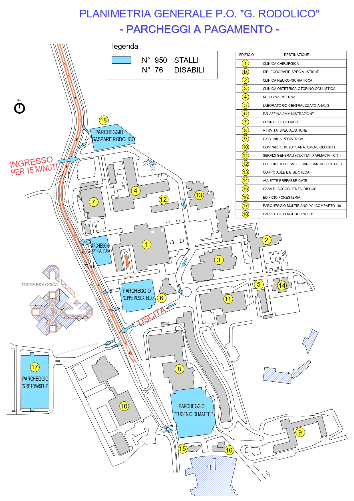 Parcheggi e Mappe All'interno di quest'area è possibile visualizzare la mappa delle singole Unità Operative e dei parcheggi annessi. Pubblicato il: 10 febbraio 2022 Ultima revisione: 5 novembre 2024 Condividi Facebook Twitter Linkedin Whatsapp Azioni Stampa Invia Parcheggi All’interno dei presidi ospedalieri sono previste aree destinate esclusivamente alla sosta dei veicoli del personale dipendente, all’utenza esterna (pazienti, accompagnatori e visitatori, specializzandi, informatori medico-scientifici), nonché al personale delle aziende fornitrici di beni e servizi. La sosta è consentita esclusivamente negli stalli destinati alle varie categorie di aventi diritto. I parcheggi per utenti/visitatori dei due Presidi sono a pagamento secondo le seguenti tariffe: • 0,8 euro/ora per la sosta dalle ore 06.00 alle ore 20.00, tutti i giorni compresi domeniche e festivi • 6 euro, tariffa forfettaria per la sosta notturna dalle ore 20.00 alle ore 06.00. Il ticket viene rilasciato da apposite colonnine poste all’ingresso delle aree riservate a parcheggio a pagamento. La tariffa da pagare verrà calcolata dalle casse automatiche installate nelle varie aree dell’AOU. Effettuato il pagamento, l’utente riceverà un biglietto che abilita l’apertura della barra d’uscita che dovrà essere raggiunta entro 15 minuti dal pagamento stesso. Sono esentati dal pagamento: a) i veicoli appartenenti alle forze dell’Ordine b) i veicoli di soccorso pubblico c) i veicoli appartenenti a portatori di handicap che recano sul parabrezza il contrassegno invalidi rilasciato dalle competenti Autorità ai quali verrà associato un tagliando adesivo rilasciato dal gestore dei parcheggi che consentirà l’apertura della barriera nelle aree specificatamente riservate e solamente in caso di presenza del soggetto titolare del permesso. d) i veicoli appartenenti alle donne in gravidanza alle quali verrà rilasciato dal gestore dei parcheggi apposito pass provvisorio per la sosta nelle aree dedicate “Strisce rosa” e solamente in caso di presenza del soggetto titolare del permesso. L’utenza autorizzata alla sosta in deroga all’obbligo del pagamento (Strisce rosa donne in gravidanza e disabili) deve rispettare la sosta negli stalli ad essi dedicati; qualora tutti gli spazi dedicati fossero già occupati, l’eventuale sosta negli stalli non dedicati sarà soggetta a pagamento secondo le tariffe orarie sopra riportate Parcheggi P.O. G. Rodolico All’interno dell’area ospedaliera del Presidio G. Rodolico sono presenti i seguenti parcheggi a pagamento: • Parcheggio multipiano “A” (“Prof. Salvatore Tomaselli), con ingresso da Via S. Sofia n. 87, nei pressi del comparto 10 (349 stalli); • Parcheggio multipiano “B” (“Prof. Gaspare Rodolico”), con ingresso da Via S. Sofia n. 88, accanto all’ingresso principale (165 stalli); • Parcheggio “Prof. Eugenio Di Mattei” con ingresso da Via S. Sofia n. 76, nei pressi dell’edificio 8 (con 81 stalli); • Parcheggio sotterraneo “Prof. Salvatore Muscatello”, con ingresso da Via S. Sofia n. 80, immediatamente successivo all’entrata dipendenti; • Parcheggio “Prof. Giuseppe Galeano” con ingresso da Via S. Sofia n. 86, adiacente al Pronto Soccorso Generale (con 56 stalli); Nelle immediate vicinanze del Presidio Rodolico è disponibile per l’utenza un ulteriore parcheggio “Santa Sofia” con 1700 stalli di sosta e con ingresso da Via Zenone, frutto di un’intesa per favorire la mobilità sostenibile tra l’Università di Catania, l’Azienda Ospedaliero-Universitaria Policlinico "G. Rodolico - San Marco", il Comune di Catania e AMTS. All’interno del Presidio Rodolico sono presenti stalli per disabili, posti “rosa” per le donne in gravidanza, posti per i mezzi a due ruote e stalli per il carico e scarico delle merci, oltre ai parcheggi riservati al personale interno all’ospedale. L’ingresso centrale di Via S. Sofia 78 è riservato esclusivamente all’ingresso del personale dipendente. Gli accompagnatori di pazienti con difficoltà a raggiungere i vari edifici del presidio Rodolico possono usufruire dell’ingresso gratuito per una durata massima di 15 minuti, previo ritiro dell’apposito biglietto dalle colonnine poste all’ingresso principale. Superati i 15 minuti di permanenza gratuita verrà applicata una tariffa forfettaria di 10 euro. L’Azienda ha predisposto un servizio navetta gratuito che collega i principali edifici del Presidio Rodolico con i parcheggi più lontani “Salvatore Tomaselli” e “Santa Sofia” e ben dodici fermate coperte da pensiline lungo i viali delle aree interne. Gli utenti con patologie gravi che hanno necessità di sostare con l’autovettura nelle immediate vicinanze dei padiglioni in cui devono ricevere le cure, potranno essere temporaneamente autorizzati compilando un apposito modulo da ritirare presso gli sportelli della ditta che gestisce la sosta. Tale modulo dovrà essere vidimato dal Responsabile della U.O. presso la quale il paziente deve ricevere la prestazione e restituito insieme a copia del documento di riconoscimento alla medesima ditta che rilascerà, previo versamento di una cauzione di 5 euro, una tessera magnetica per usufruire della sosta gratuita per la durata delle cure indicata nel modulo. Per i pazienti con difficoltà deambulatorie sono inoltre disponibili sedie con rotelle presso l’Edificio 1, 2, 3, 4, 8 e 9. Il loro utilizzo avviene introducendo una moneta (da 50 centesimi o da 1 euro) nell’apposito slot. Al termine del suo utilizzo, la sedia a rotelle dovrà essere ricollocata nel medesimo punto di prelevamento, con restituzione della moneta introdotta. Parcheggi P.O. San Marco Gli utenti possono entrare con il proprio mezzo all’interno dell’area ospedaliera del Presidio San Marco dall’ingresso di Viale Carlo Azeglio Ciampi. È disponibile un’ampia area di sosta con 784 stalli per gli utenti, di cui 30 parcheggi “rosa”, 9 riservati alla 